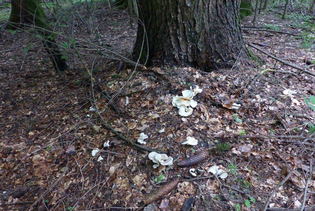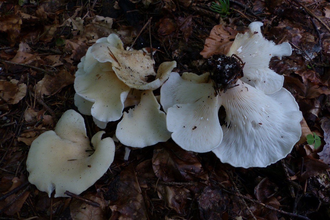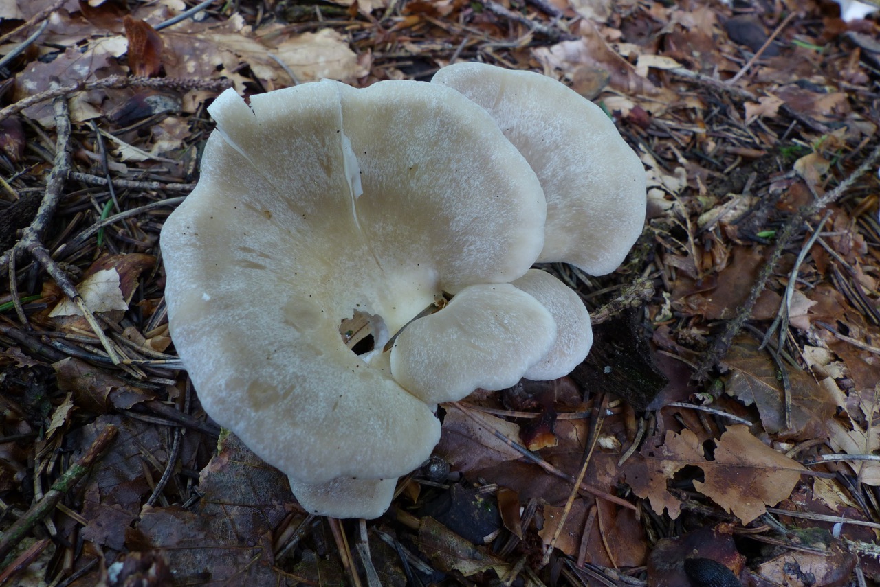 Schon lange habe ich mir gewünscht Hohenbuehelia geogenia zu finden. Nun fand ich einen sonderbaren weisslichen Seitling am Boden, bei dem ich zuerst an Phyllotus porrigens dachte. Der sollte aber doch auf Holz wachsen. Das Mikroskop enthüllte die tollen dickwandigen Zystiden die ich von Hohenbuehlia fluxilis kannte, dort aber mit schönem Kristallschopf. Der Wuchsort auf Nadelstreu und die Grösse liessen an Hohenbuehelia geogenia denken, doch einiges stimmte nicht: