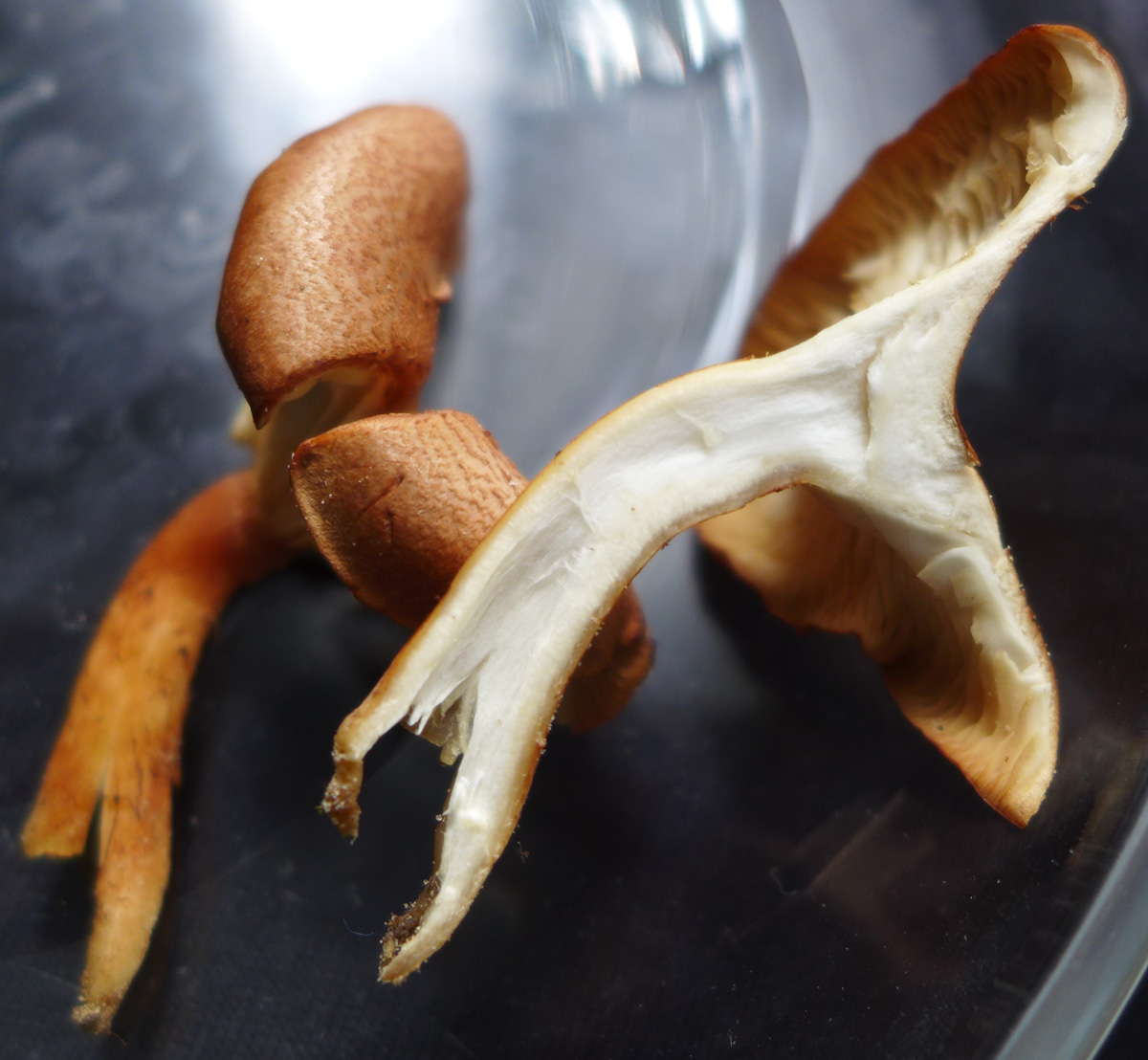 Der Hut ist auffällig feinschuppig und wirkt irgendwie vertraut, ich vermute von ähnlich aussehenden Ritterlingen. Lamellen deutlich heller als der Hut, leicht ablösbar, ohne "Burggraben". Keine Milch und Stiel deutlich längsfaserig. Standort: sandiger Kiefernmischwald. Geruch: nach Gurke/Mehl. Tom fand nach Wanzen. Riechen die ähnlich? Ich habe noch nie an Wanzen gerochen. Der Sporenabwurf war zögerlich, aber ausreichend um es als weiß oder sehr hell zu bezeichnen.
