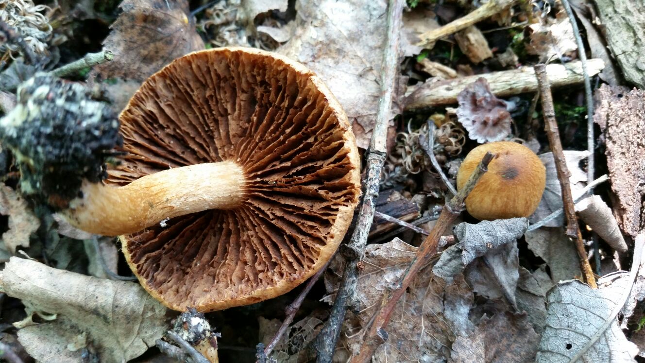 Ich kann eine Cortina erahnen, der Pilz wuchs auf der Erde begleitet vom verblassenden Birkentäublingen und einem Erdwarzenpilz. Allesamt in Massen auftretend.
