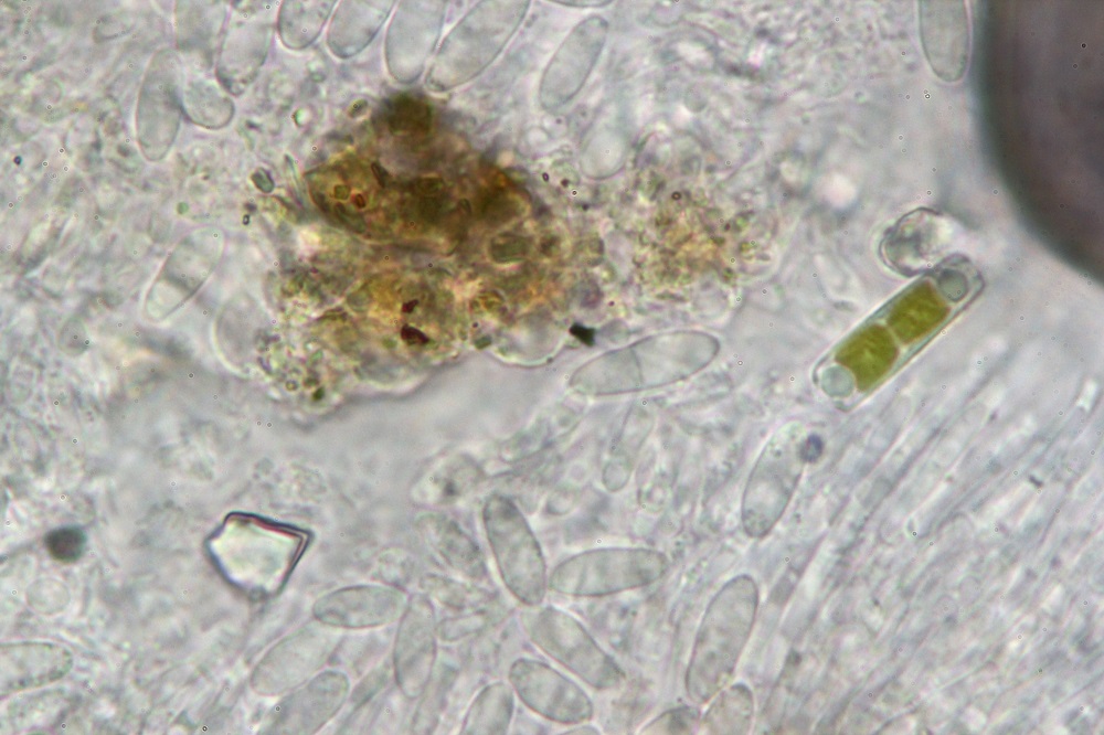 Reaktion in Lugol mit Fremdspore oben rechts