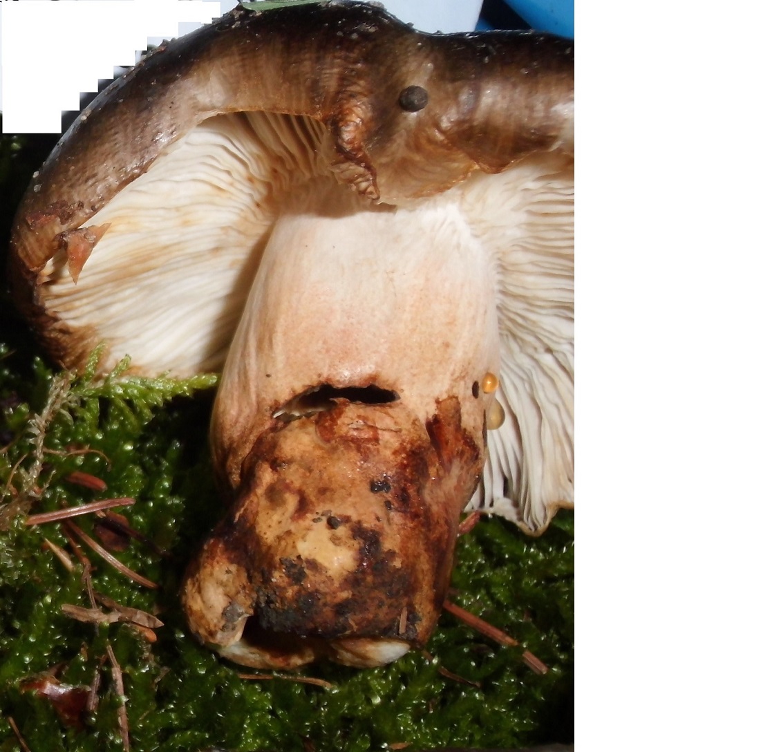 Allerdings schwärzte da nichts. Nach einem Tag liegen bräunten die Lamellenschneiden und auch von der Stielbasis ging es los. Der typische Geruch stellte sich ein und die Reaktion mit FeSO4 (grau-grün) bestätigte, dass etwas aus der Gruppe der Xerampelinae gefunden hatte. Ich dachte da an R. cicatricata,der soll lt. Beschreibungen auch eine dunkle HDS haben können, aber so sehr?