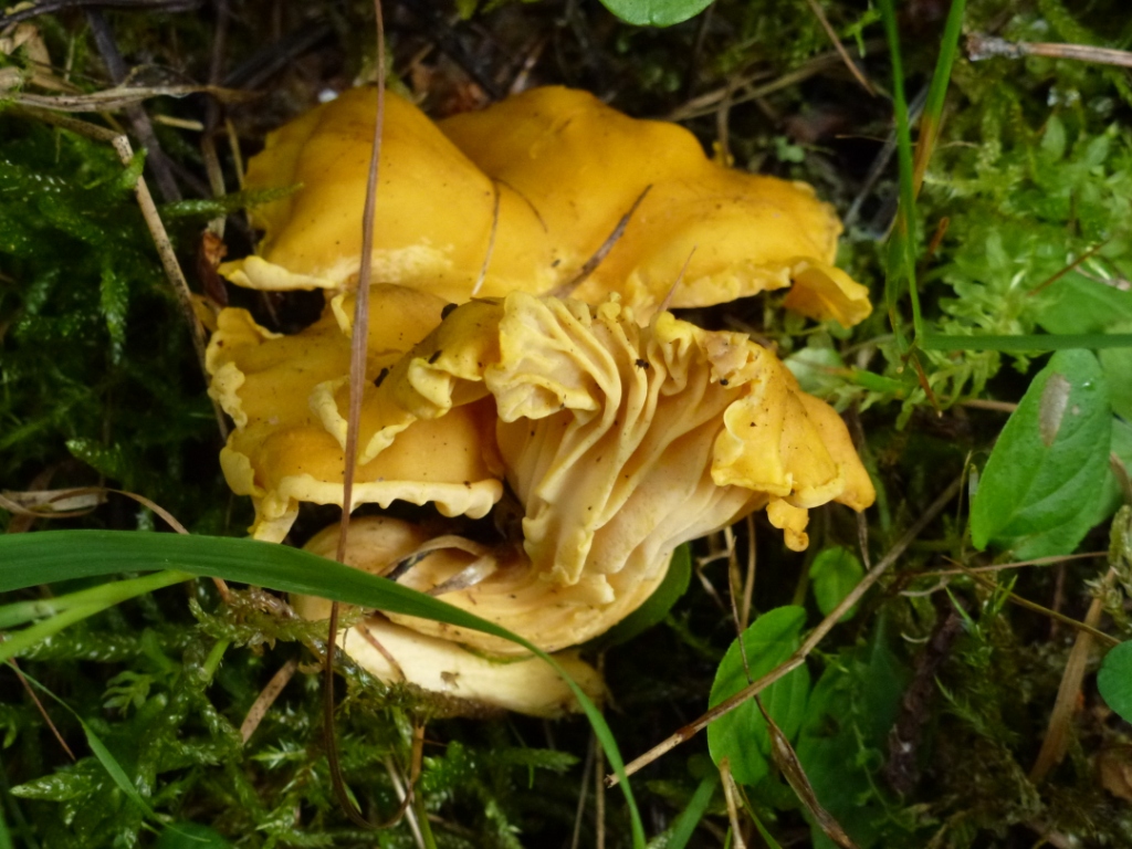 Denn Gelbere (Pfifferlinge) gibt es stellenweise sehr viele! Dies sind vor allem die, die wir als die "Unterirdischen" bezeichnen. Sie wachsen "unsichtbar" unter dem Moos und man findest sie erst, wenn sie schon ziemlich groß sind und ein wenig aus dem Moos hervorspitzen.