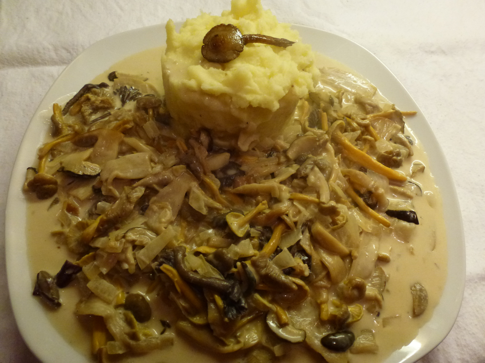 Vielleicht interessiert es ja den einen oder anderen wie ein Grünspanträuschling oder ein Amethystblauer Lacktrichterling schmeckt. Ich habe mir gerade eine gemischt Pilzpfanne aus den Reifpilzen, den Trompetenpfifferlingen, Butterpilzen, ein paar Maronen und den Lacktrichterlingen gemacht. Den Grünspannträuschling habe ich separat gebraten und oben auf den Stopfer