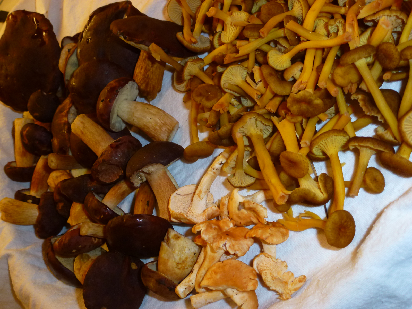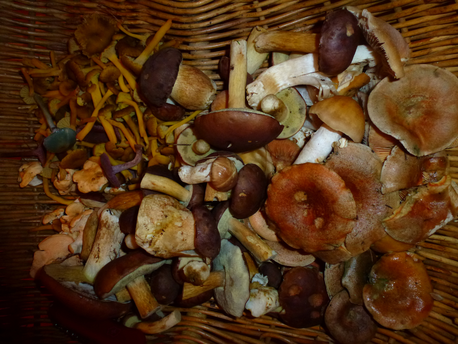 Links in meinem Korb sind Reizker, Reifpilze und Maronen.