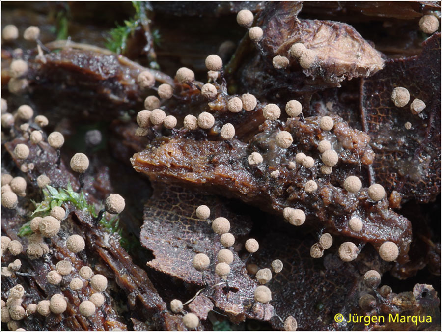 Cribaria ist für mich schwierig zu schlüsseln, ohne große Erfahrung kann ich die Strukturen, z.B. die Art der Knoten der Peridie kaum beurteilen. Hier mal eine Kollektion, die ich provisorisch Cribaria persoonii getauft habe, nach dem ich ein bisschen geschlüsselt habe (Baumann-Bände).