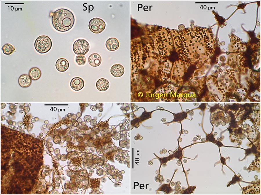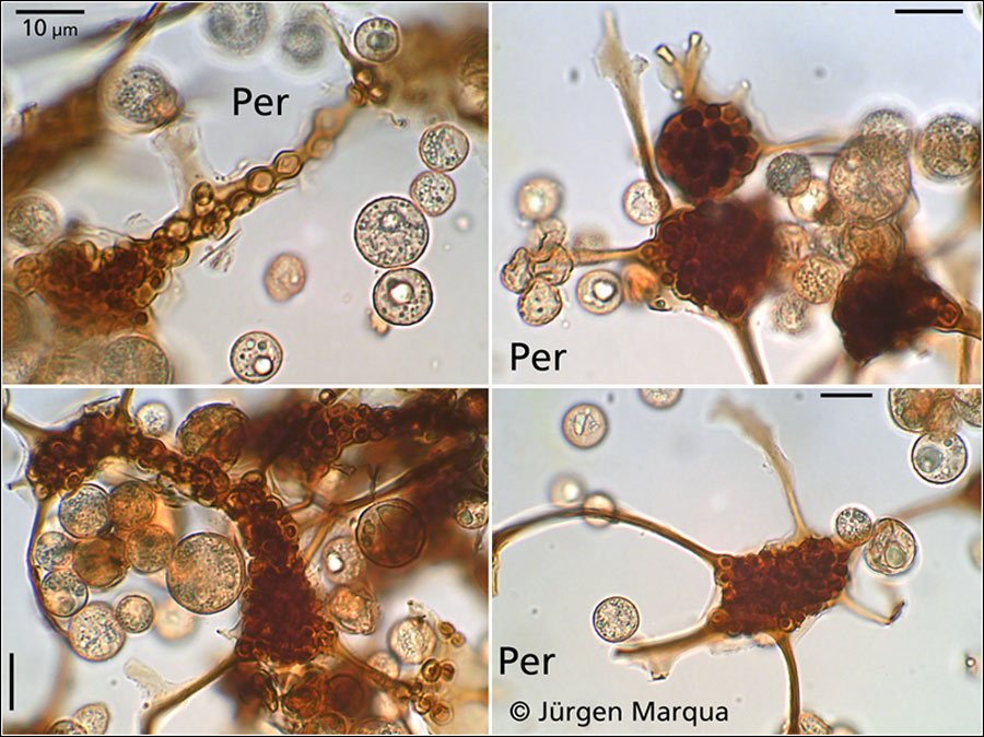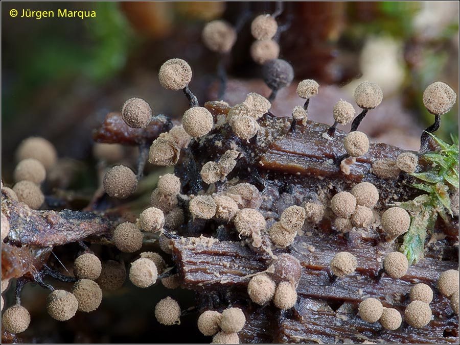 Kurzbeschreibung: Sporocarpien aus gestielten Kügelchen bestehend, Peridie ist in Form eines flachen Kelchel noch erhalten, das Netz ist mit etwas verdickten Knoten und vielen Granula, Sporocarpien 0,6-0,8 mm breit, Sporen 7-8 µm im Durchmesser (es gibt auch aufgeblähte Riesendinger), Farbe der Köpfchen hell ockerbraun, Sporenpulver hell braun.