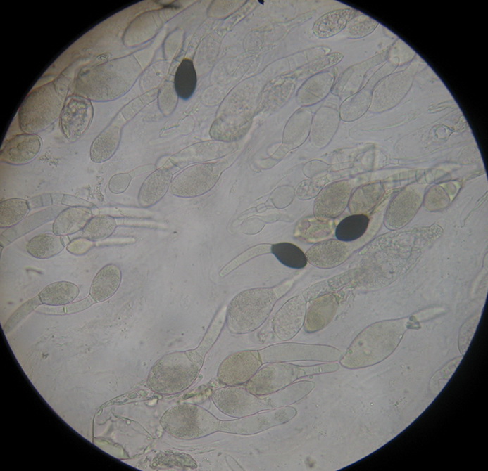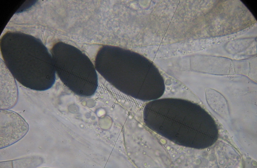 Sporen 9-10 x 7 µ, rundlich-zitronenförmig,mit je einem Polzipfel ( Keimporus ?), glatt, guttuliert, grünlich, unreif dextrinoid! ? Zumindest nehmen sie die Farbe des Lugols an.