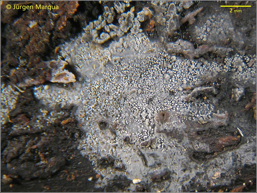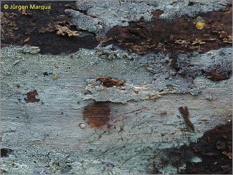 dieser graublaue Belag befand sich auf einem optimalmorschen, entrindeten Birkenastes. Fundort war ein Erlenbruch. Mit dem Ryvarden geschlüsselt kommt man da zu Phlebiella tulasnelloidea (jetzt Xenasma tulasnelloideum), jedoch sind die Sporen dieser Kollektion etwas zu klein: