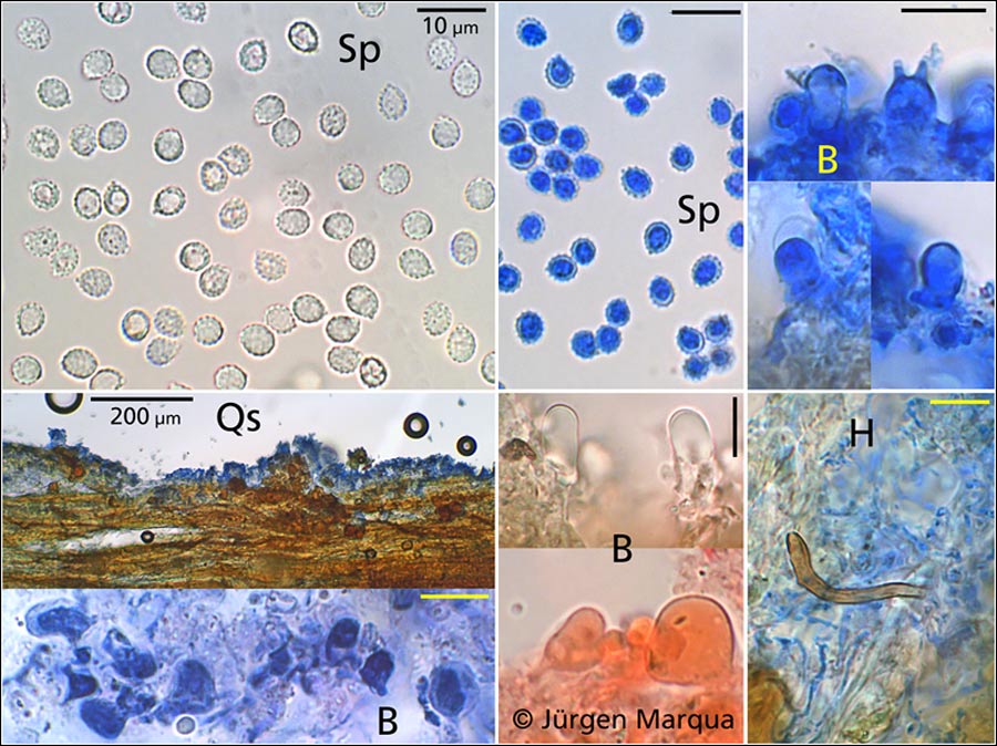 wichtiges Trennmerkmal dieser Art ist die graublaue Farbe des Basidiocarp und die Suprahilardepression der subglobosen bis breitellipsoiden Sporen (haben die anderen Arten mit stacheligen Sporen wohl nicht). Diese "Delle" an den Sporen meine ich aber deutlich zu sehen. Was könnte hier noch in Frage kommen?