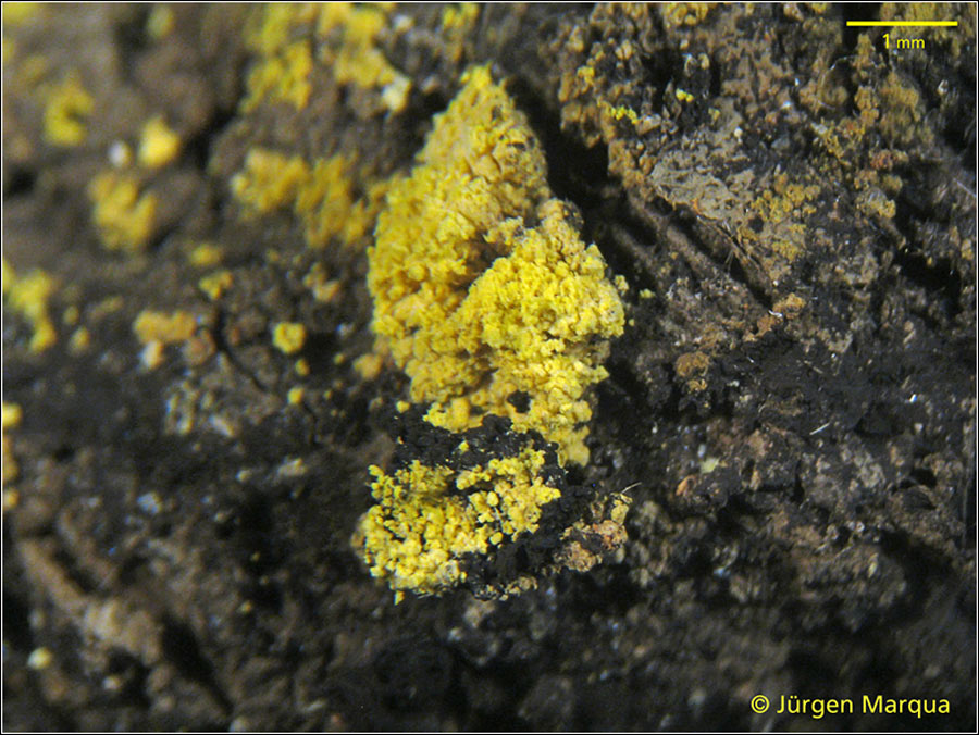 folgenden, seltsamen Ascomyceten fand ich auf einem angetrockneten "Köttel" irgend eines Tieres. Fundort war ein ebenerdiger Kellerraum eines Bauernhofes, die Köttel und schwarze Pilzreste eines Dunkelsporers lagen auf dem Lehmboden dieses Raumes. Nimmt man das Substrat etwas auseinander, zeigt es im Innern eine faserig / haarige Stuktur (vielleicht die Hinterlassenschaften eines Hasen, Kaninchen, Huhn?). Auf dem Köttel dann dieser fast leuchtend gelbe Belag.