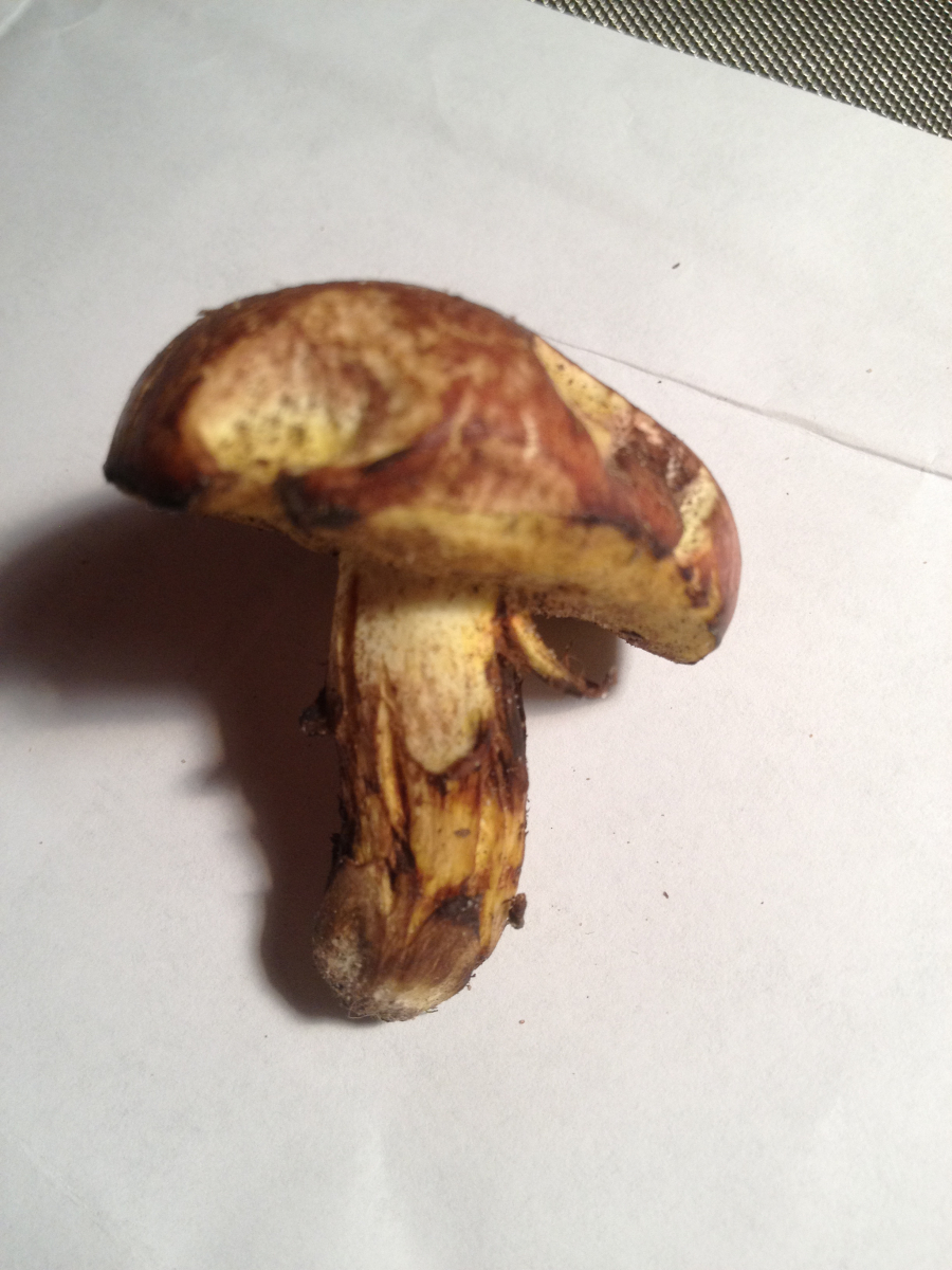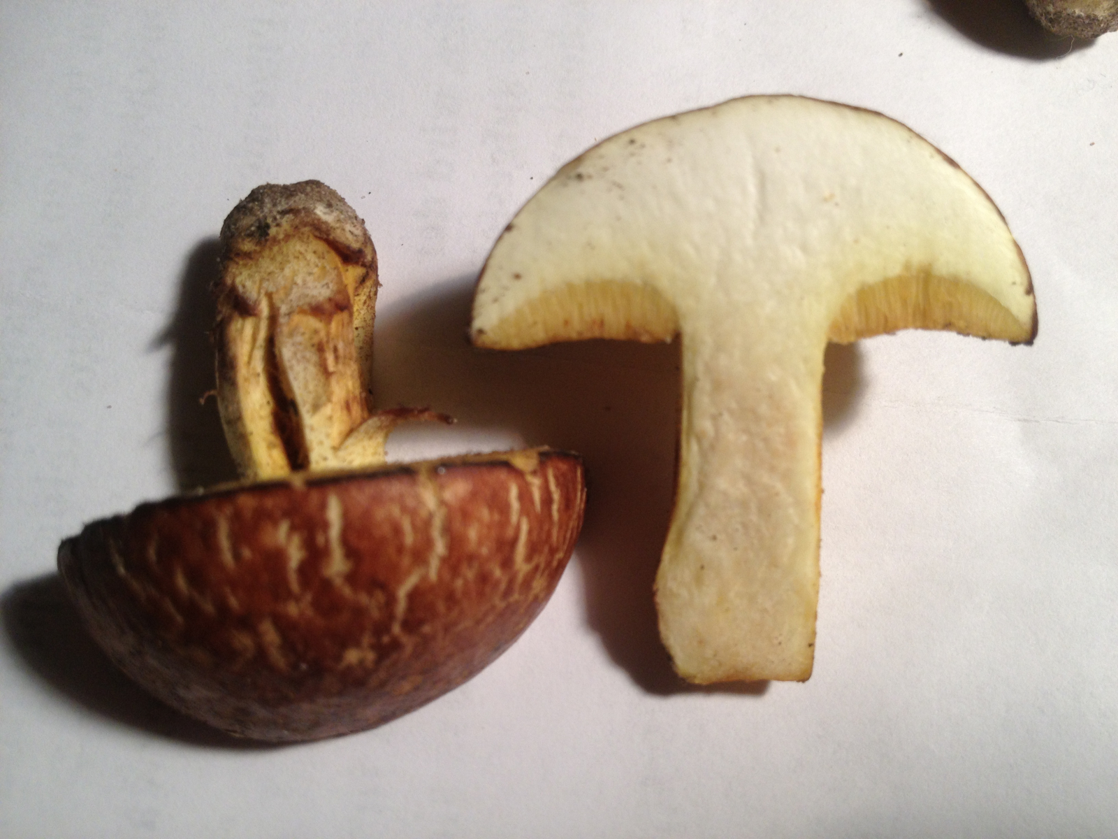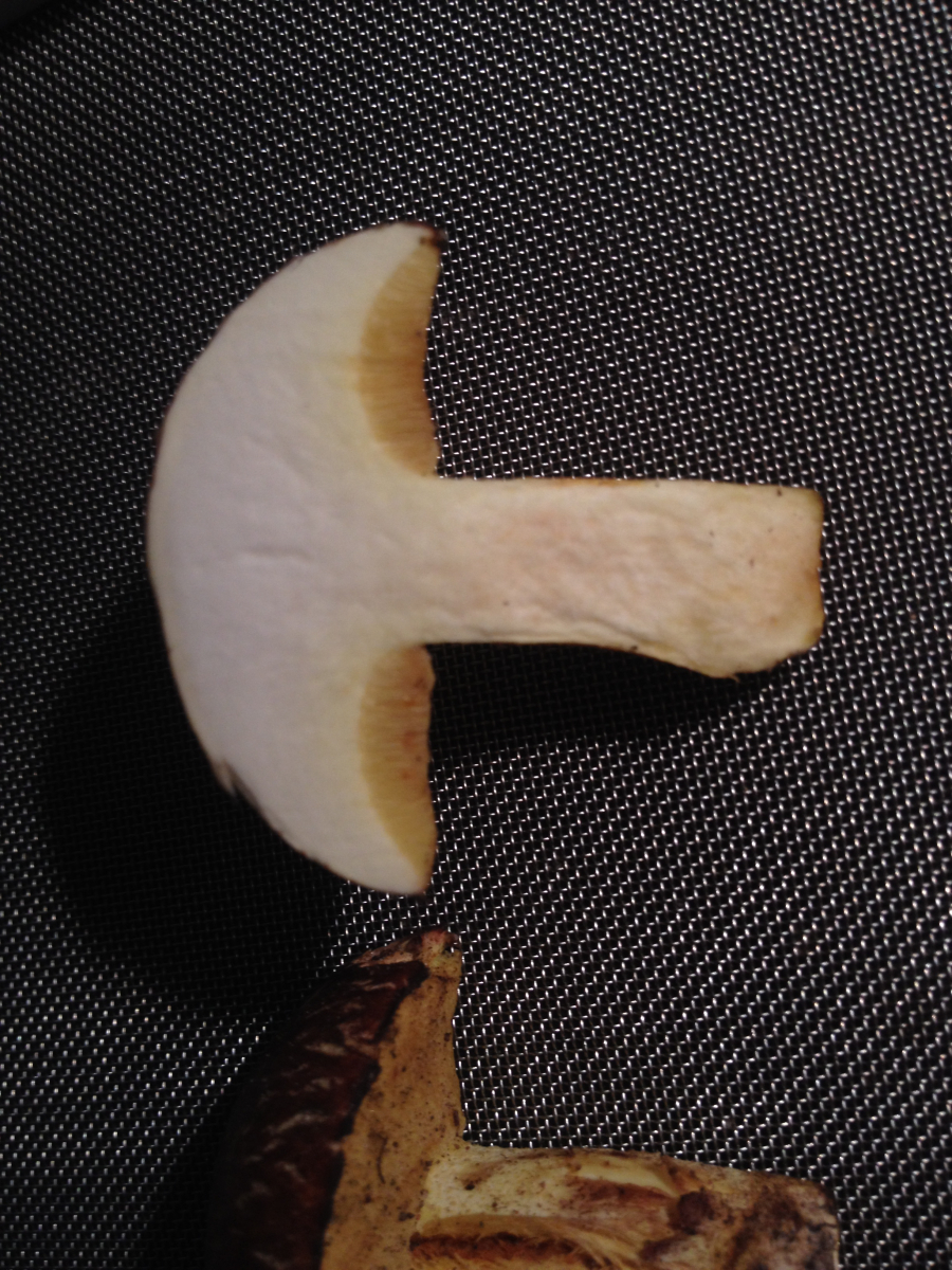 Was man anhand des Schnittbildes ausschließen kann: >Xerocomus subtomentosus<, weil da rein gar nichts blaut und weil null rosaton im Stielfleisch bei gleichzeitig satt gelbem Hutfleisch, und Xerocomus moravicus (Mährischer Filzröhrling) kann man auch vergessen, das ist eine weißfleischige Art.