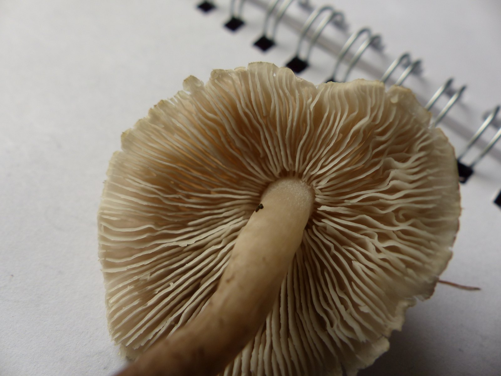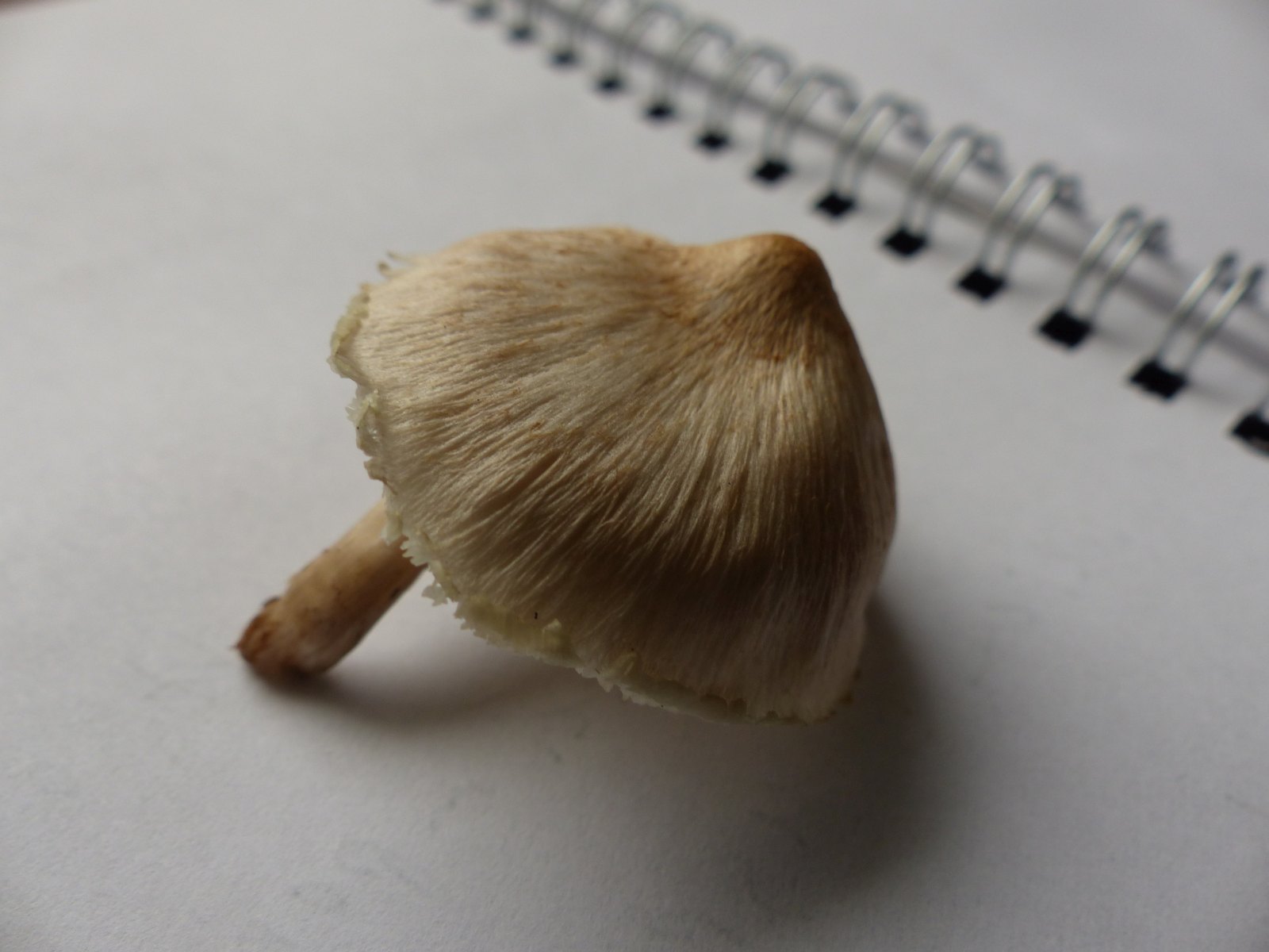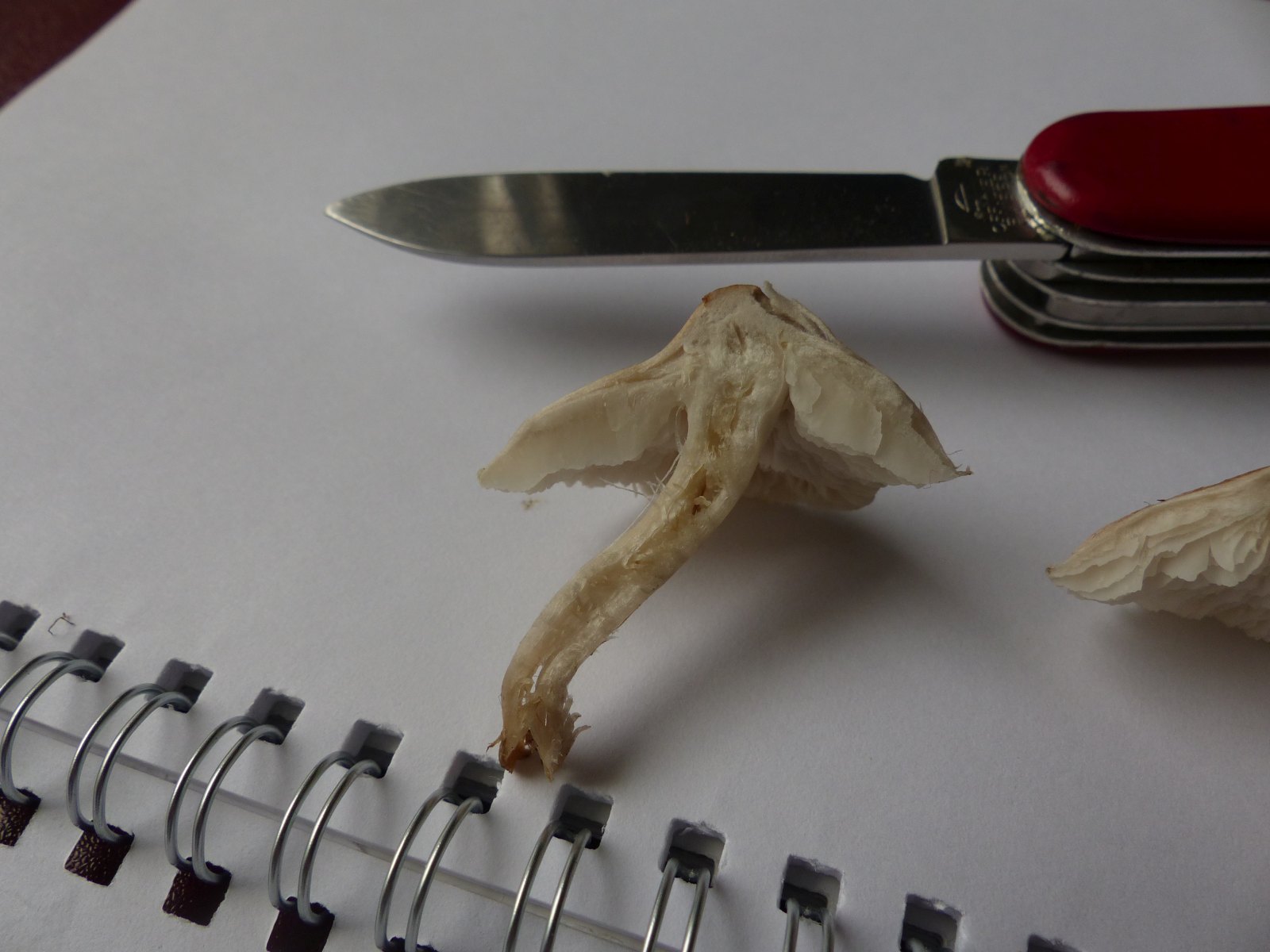 Von oben sah er wie ein Risspilz aus. Sehr radialfaserig. Allerdings sporte er eindeutig weiß. In der Nähe gab es noch Maipilze.