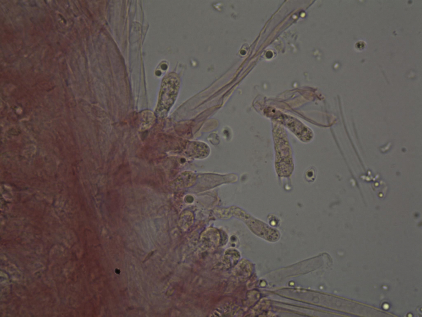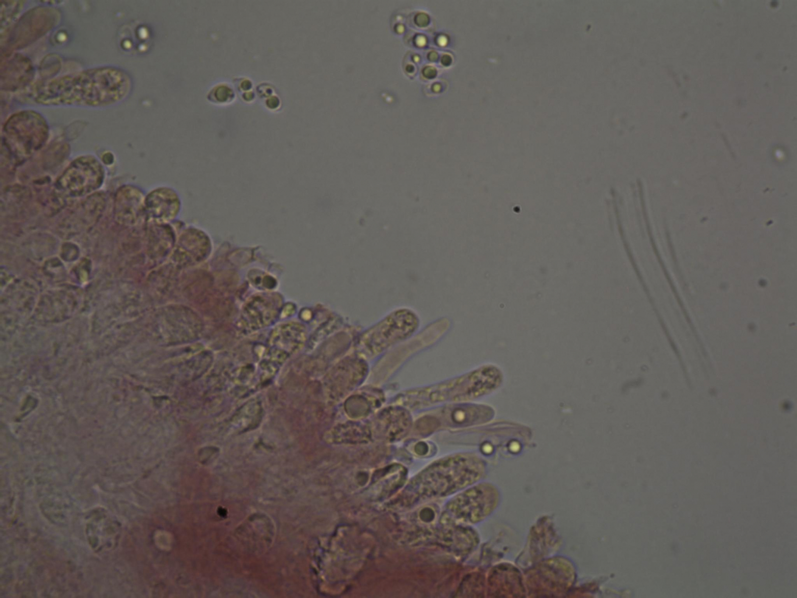 Eine Frage noch zum letzten Bild: Ist das Lamellenfläche oder Lamellenscheide? Und waren da noch mehr solche Elemente, auch in anderen Geweben (Huthaut, Stielrinde an Stielspitze)? Theoretisch könnte das auch ein verrutschtes Hyphenende aus der Lamellentrama sein, sowas hat mich auch ab und an schon in die Irre geführt.