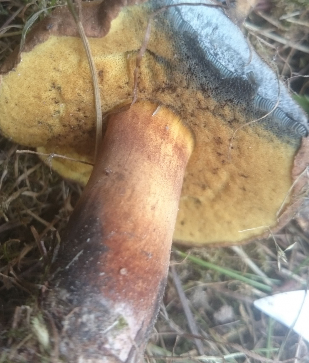 Diese Gruppe fand ich bei am Rande eines alten Douglasienbestandes. Die Blaufärbung setzte sofort ein und wurde nach ca. einer Minute schwärzlich. Ich denke das ist der Schwarzblauende Röhrling.