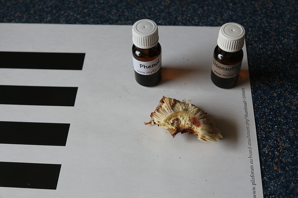 Edit: Eisensulfat und Phenol sollte man bei Täublingen auf der Stielrinde und nicht im Hutfleisch testen.