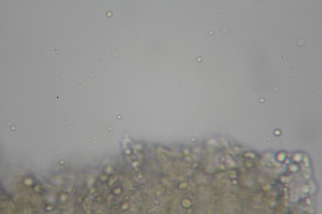 Apothecien konnte ich keine finden, der FK war auch unter dem Stereomikroskop. Mit deiner Vermutung einer zufälligen Verschmutzung wirst du richtig liegen. Ob die Sporen zu einer Scutellinia oder Melastiza gehören interessiert mich fast mehr als die Bestimmung des Täublings.