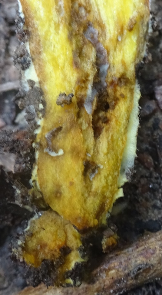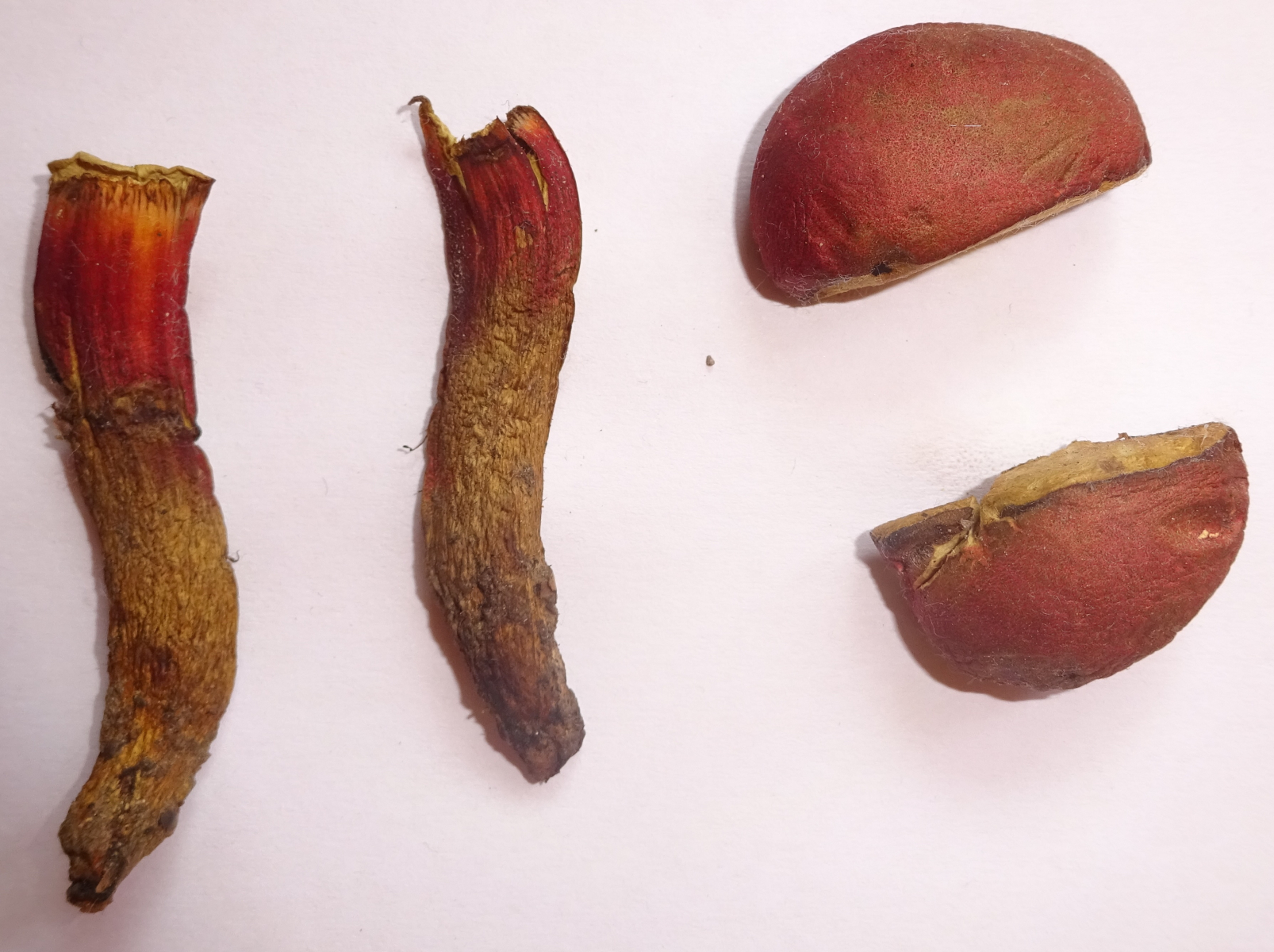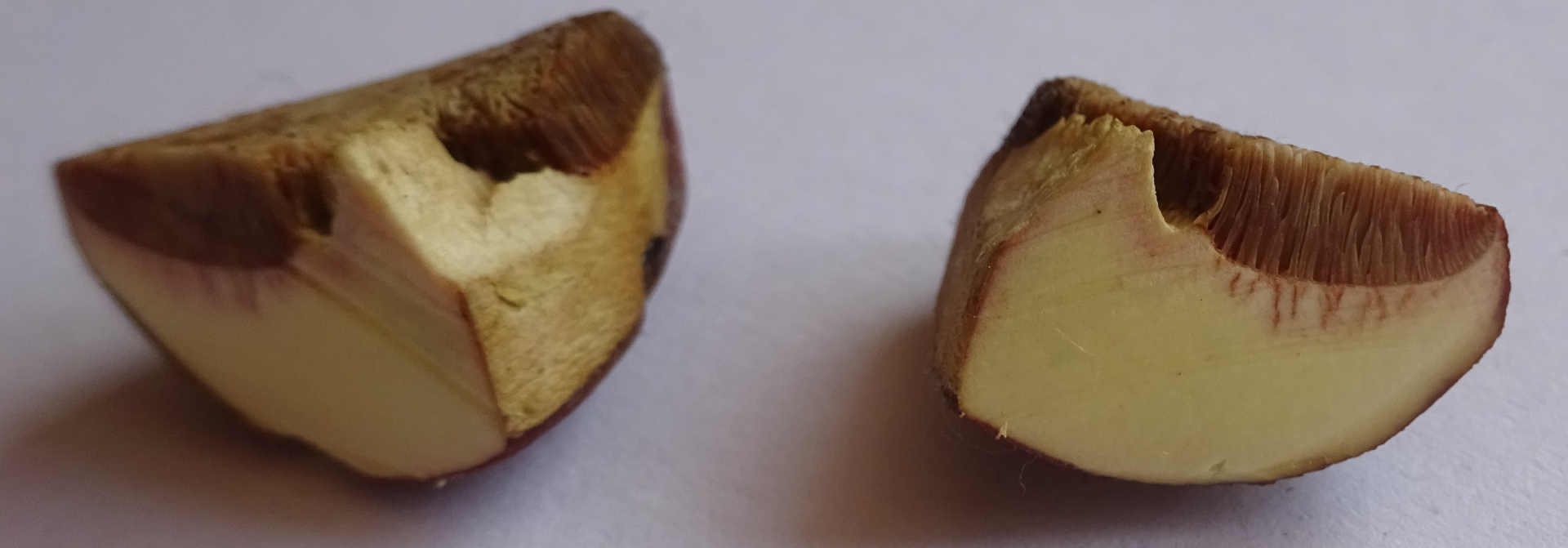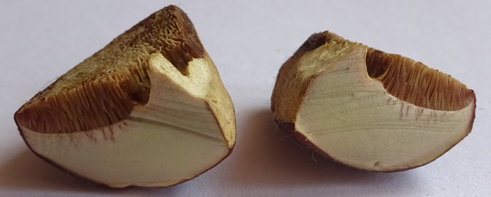 Der Aprikosenfarbene Röhrling müsste aber in der unteren Stielhälfte karottenrotes Fleisch haben und zudem im Hutfleisch und Stielspitze deutlich blauen. Kann man hier also ausschließen. Ebenfalls deutlich im Fleisch blauen müsste Xerocomellus ripariellus (Ufer - Filzröhrling).