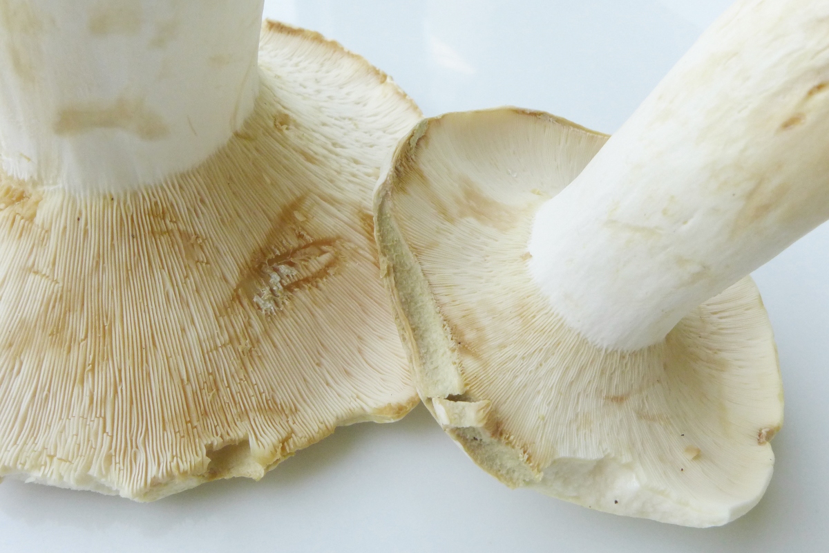 Alle Lamellen waren sehr dicht, alle leicht "aprikotfarben", alle Pilze mit leichter Gilbung, KEIN Pilz mit vor Ort sichtbarer grünlicher Verfärbung.