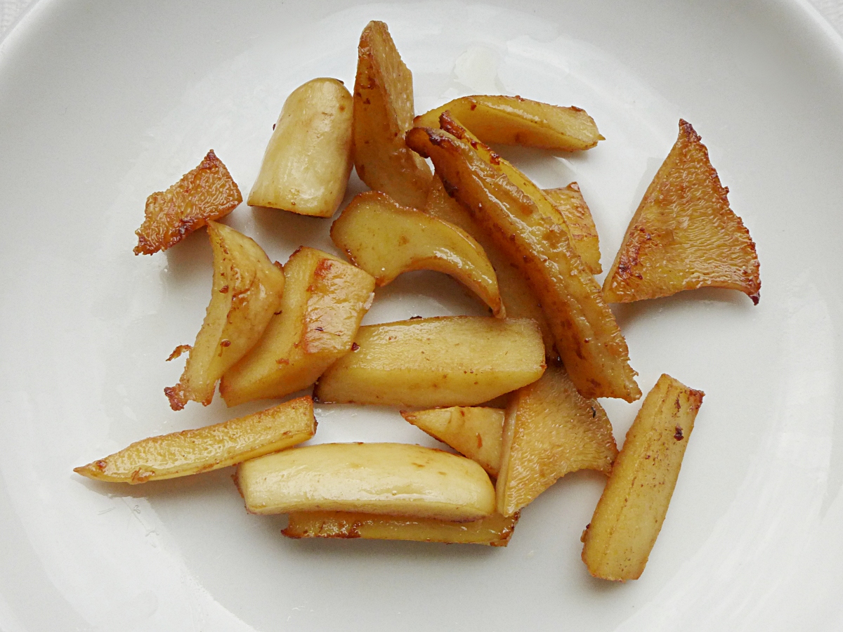 Die Stückchen nehmen den Geschmack sehr gut auf, sie werden außen je nach Bratdauer etwas etwas kross (nach Gutdünken), sind innen aber schön saftig mit gutem Biss.