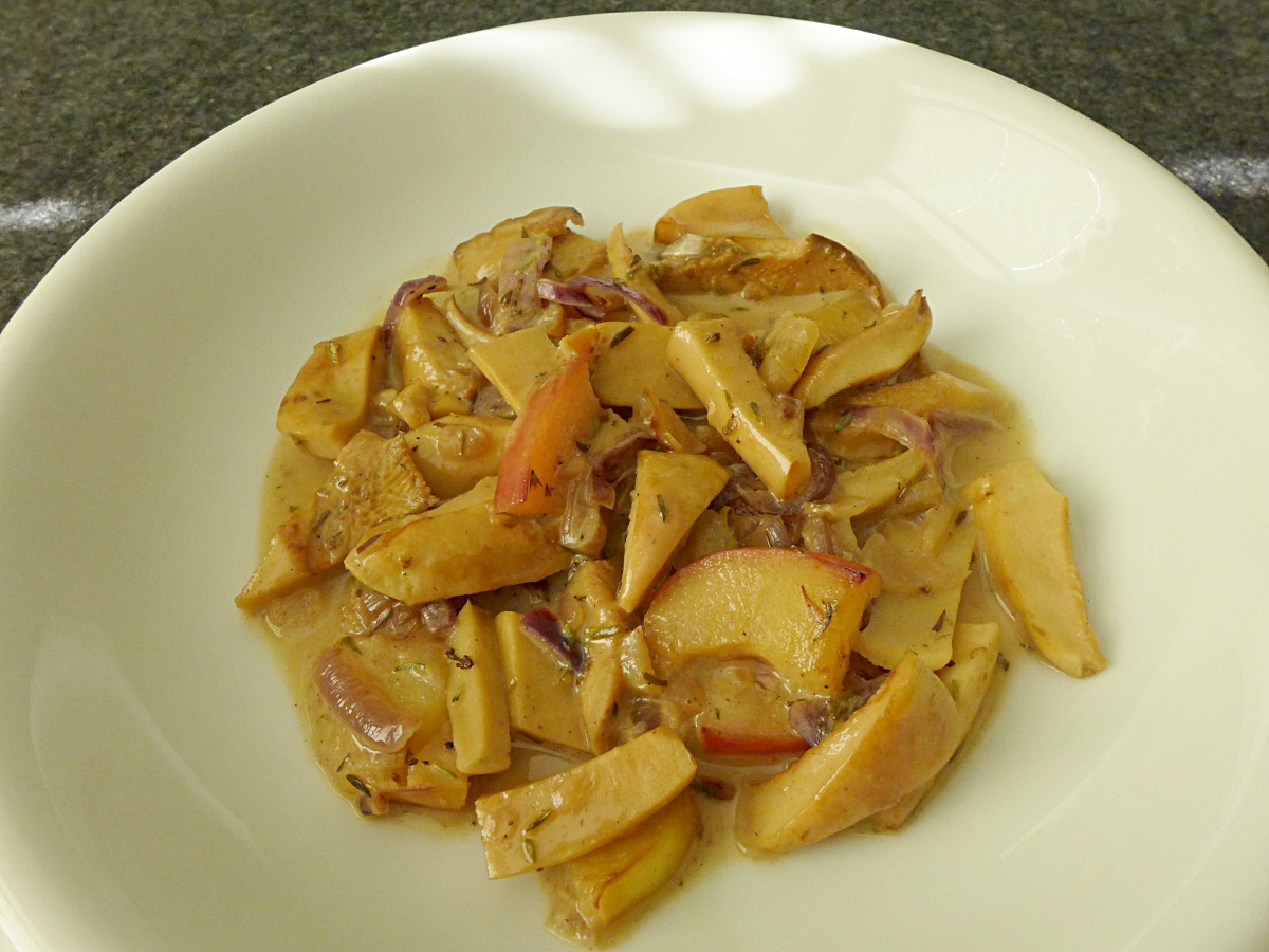Restliche Pilzmenge ähnlich zubereitet, aber dann noch (separat vorgegarte) Zwiebeln, Knoblauch dazu, Thymian, Pfeffer und ein Apfel in Stückchen, mit Sahne abgelöscht und noch mal kurz reduziert.