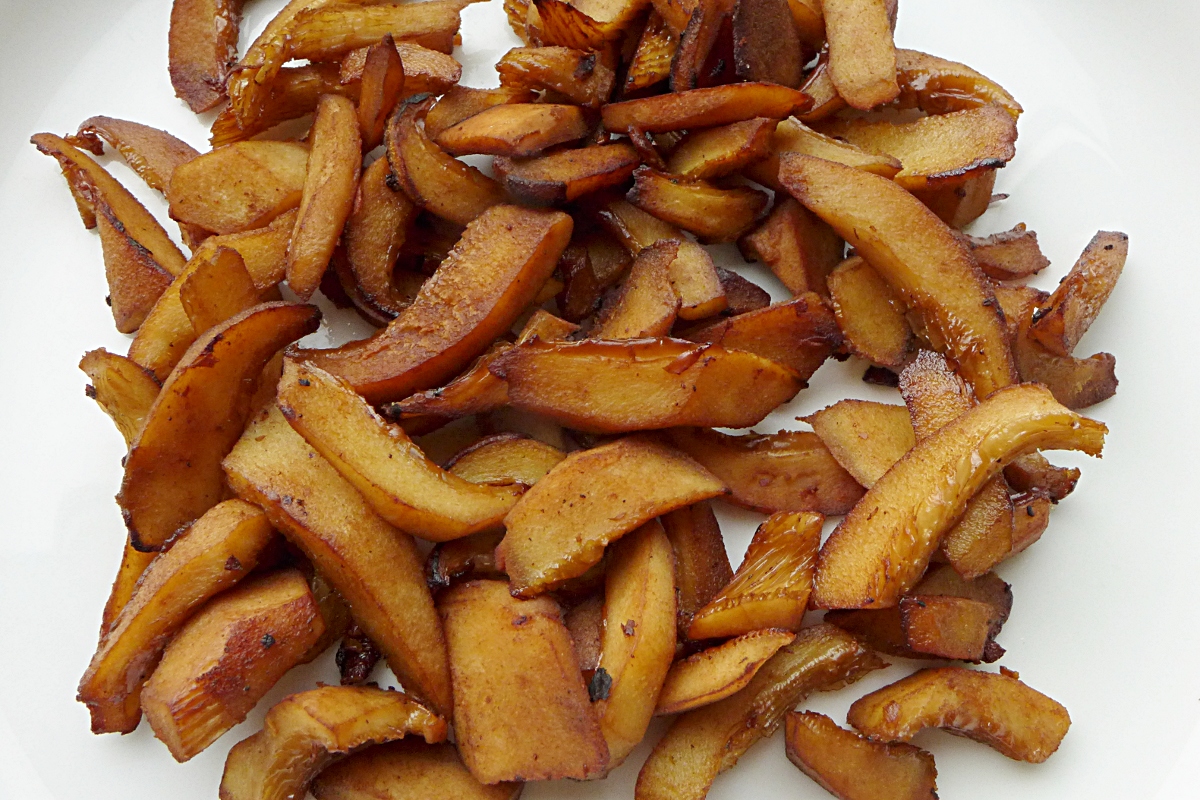 in heißem Öl: fast sofortige Entschärfung (ist aber viel Arbeit, die Stückchen müssen fürs "Krosse" sehr dünn sein, die Pilze werden sehr leicht zu braun. Hat man viele davon, dann kommen einem die recht fetten Chips "auch leicht aus den Ohren heraus", vor allem bleiben sie nicht knusprig, sie sind eigentlich gut nur für den sofortigen Verzehr.