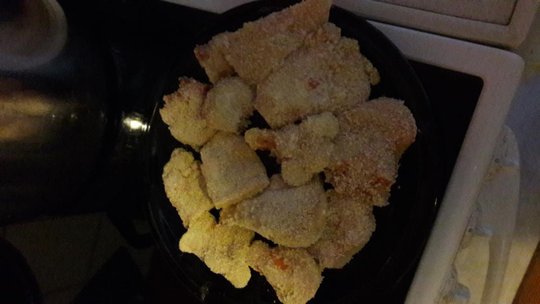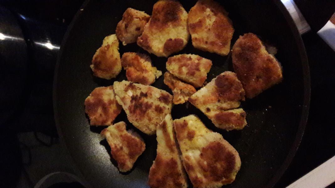 Danach etwas kleinere Nuggets schneiden und panieren wie ein Schnitzel (mit Mehl bepudern, dann in gesalzenem Ei wenden und schließlich in gesalzenem Paniermehl welzen)...