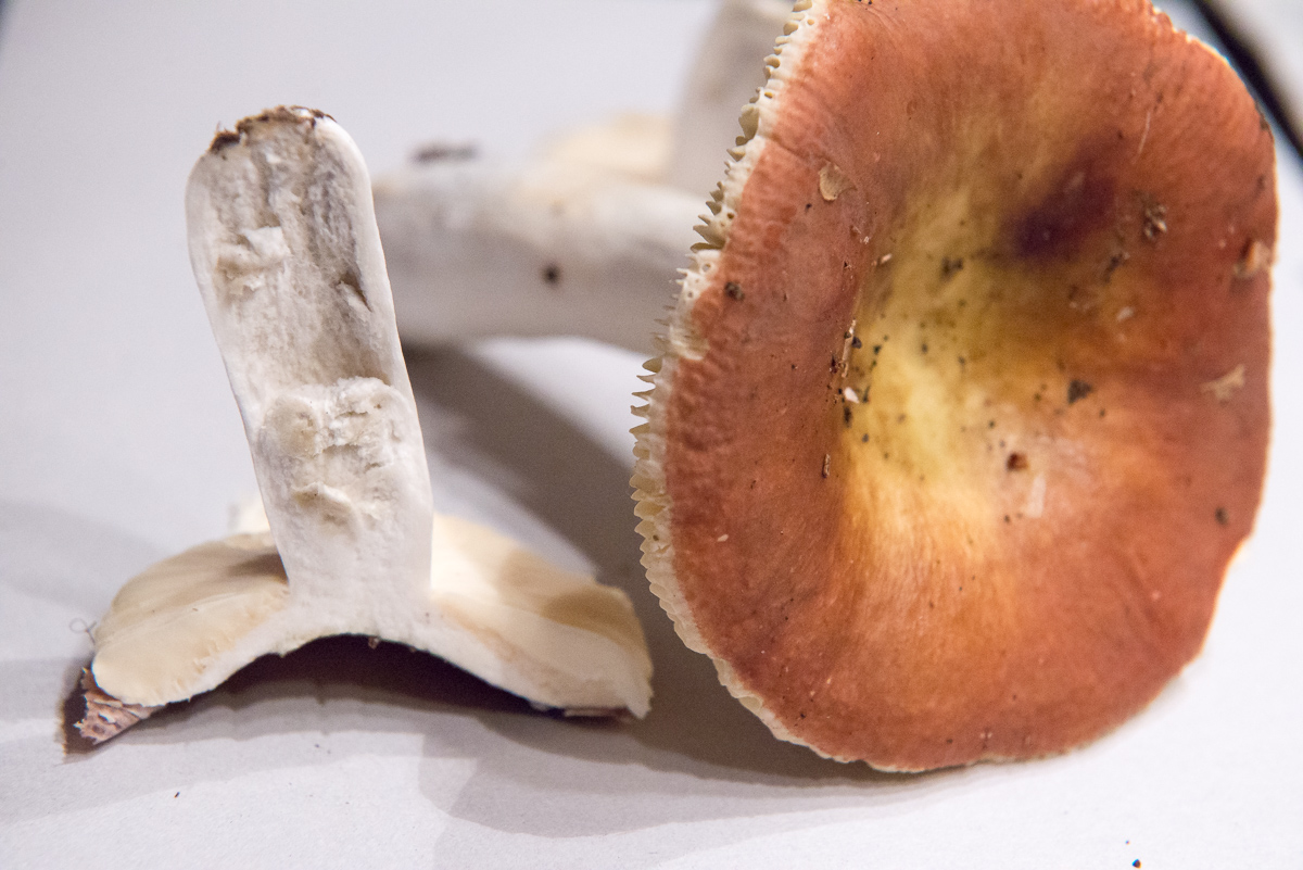 Täubling im obigen Beitrag. Ich hatte den gestern nach dem Fund zuerst auch als R. vesca fehlbestimmt, bis ich heute die gelben Sporen sah. Der ist zum Glück durch die markanten Sporen eindeutig. Der wuchs direkt neben R. vesca und sah auch noch fast so aus. Ja so kanns gehen. :D Täublinge halt.