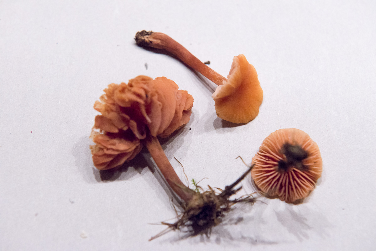 Lacktrichterling passt, der gehört in die Gruppe um den Rötlichen (Laccaria laccata), wo allerdings die einzelnen Arten sehr schwer gegeneinander abzugrenzen sind (muss man auch mal durchs Mikro gucken). Aber wenn mans nicht ganz so genau braucht, täte es auch "einer der rötlichen Lacktrichterlinge".