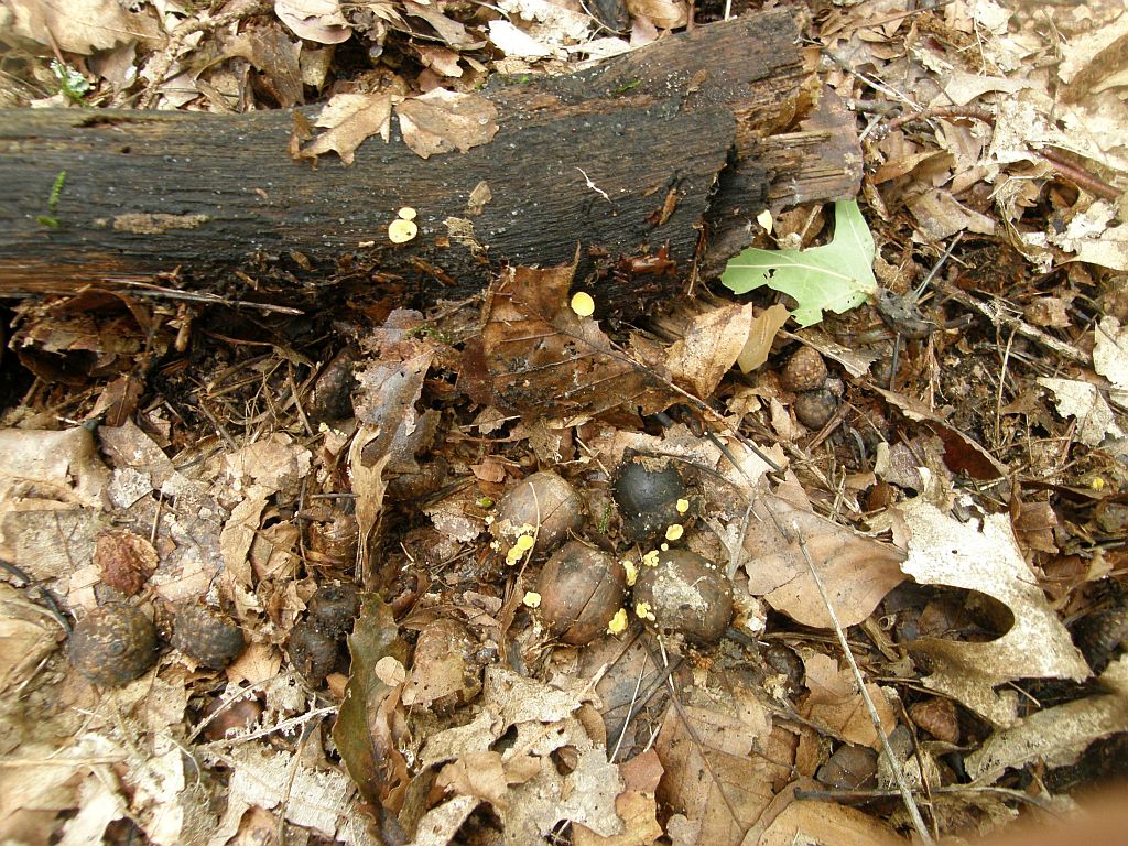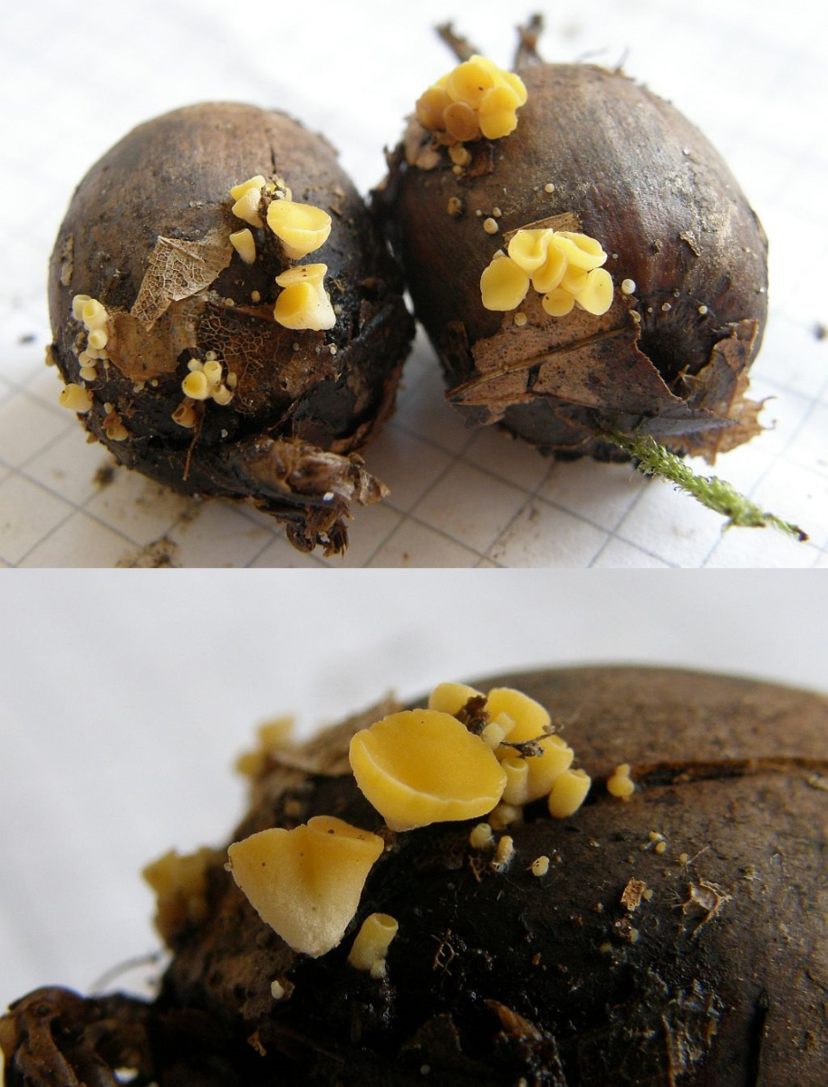 Da hätte man haufenweise Arten mit einem Handgriff einsammeln können, konzentiert habe ich mich auf eine. Die Becherchen wachsen vorwiegend an Eicheln, gelegentliche Überläufer sitzen auch an Holz und an Blättern. Apos deutlich gestielt, Außenseite vor allem zur Basis hin weißfilzig, Becherränder auch im Alter nicht nach unten einrollend.
