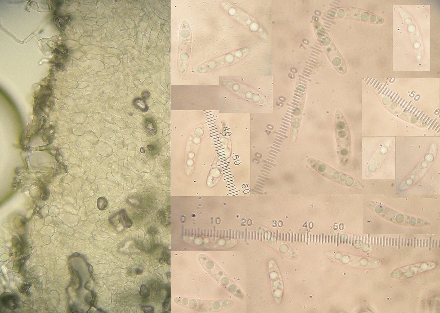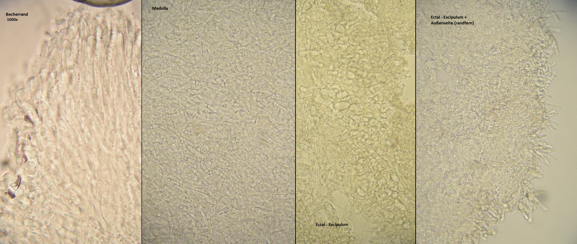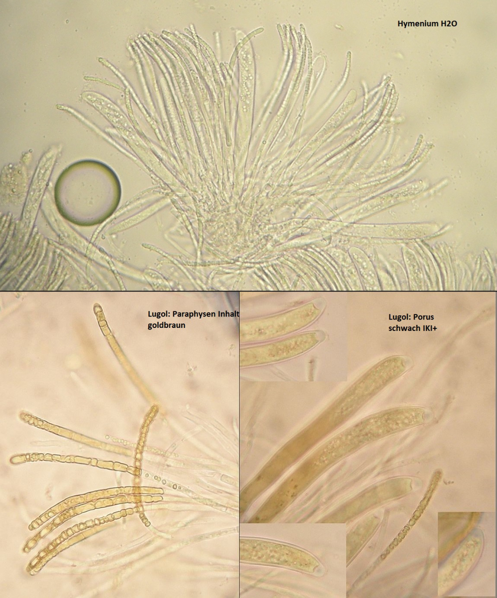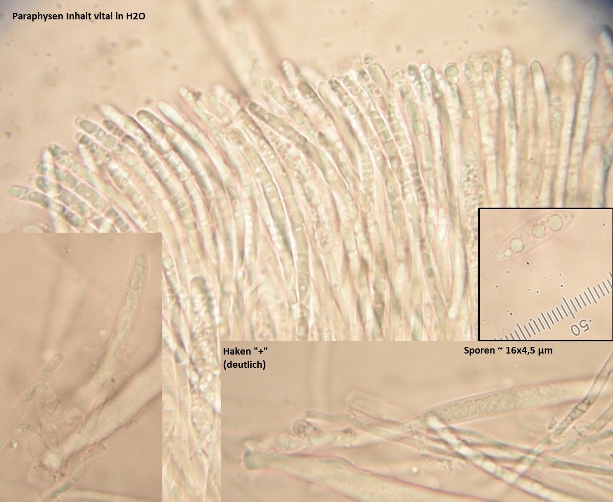 Theoretisch tendiere ich zu >Hymenoscyphus monticola<, wenn da nicht ein paar Details seltsam wäre. Erstens: Inhalt der Paraphysen in Lugol nicht rotbraun, sondern goldbraun. Zweitens: Ectal - Excipulum nur dünn und keine wirklich eindeutige (gut entwickelte) textura angularis. Mehr eine Mischform aus angularis und intricata. Drittens: Gehört Hymenoscyphus monticola nicht in eine andere ökologische Nische? Also planarer Standort, submediterranes Klima: eher unpassend?