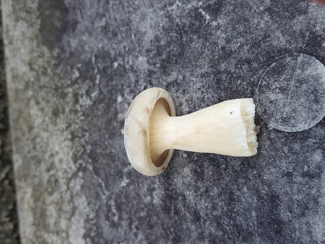 Oh, 4 cm ist nicht arg viel. In dem Fall rate ich zu einer Geruchsüberprüfung, ob der womöglich stark nach "Maipilz" riecht. Dann würde ich mal so pauschal zum Mehlräsling (Clitopilus prunulus) tendieren.