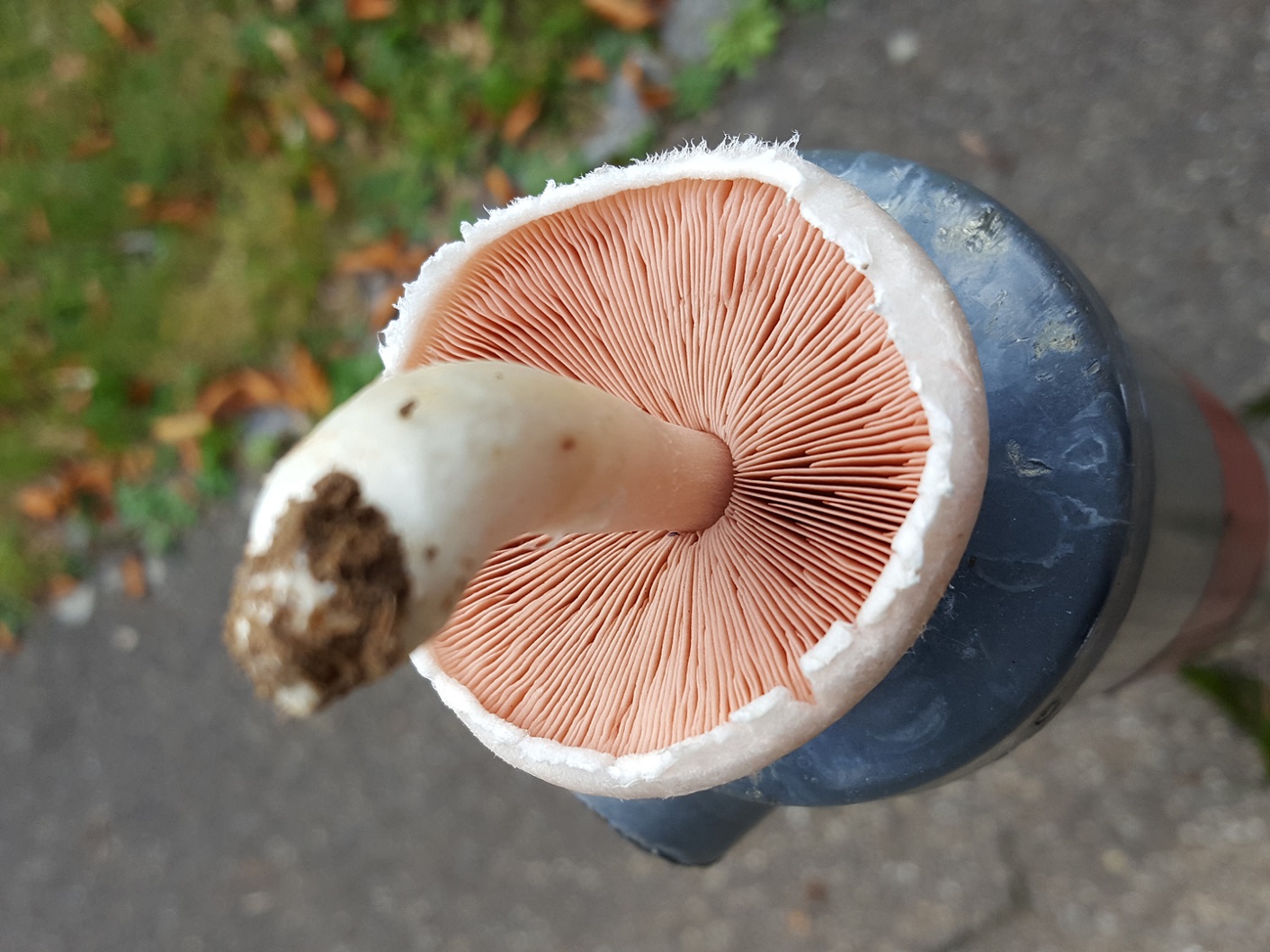 Wenn die Lamellen noch so schön rosa sind, darf man ruhig noch einen Rötling im Kopf haben (ist aber in dem Fall keiner, nur so für das Sicherheitsinteresse des Sammlers), aber wenn man da mal Zweifel hat: Ein Stückchen vom Hut abbrechen und absporen lassen (sollte bei so frischen, vitalen Pilzen in zwei bis drei Stunden was zu sehen sein), und dann muss der Abwurf schon schön braun sein ohne Rosaton.