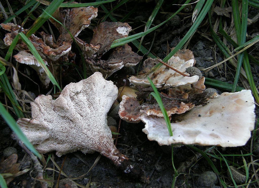 Beim letzten Pilz (6) könnte ich mir gut vorstellen, daß da vergrabenes Laubholz unterm Rasen liegt. Du könntest mal drunter gucken, ob da recht grobe, unregelmäßig labyrinthische Poren unter den Hüten sind, und ob das Ding sich an verletzten Stellen langsam rötlich verfärbt. Dann käme der Rötende Saftwirrling (Abortiporus biennis) in Frage: