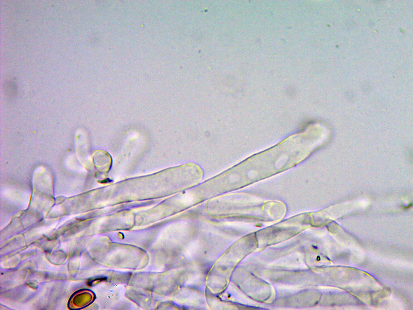 Lamellen: cremefarben, an der Grenze von angeheftet und frei, Schneiden fein gesägt, wenige Lamelletten