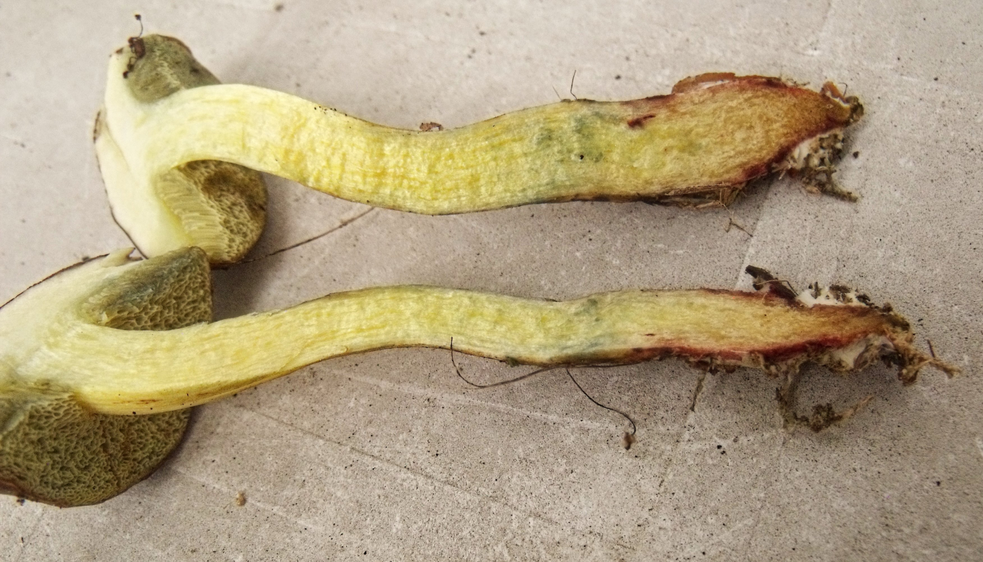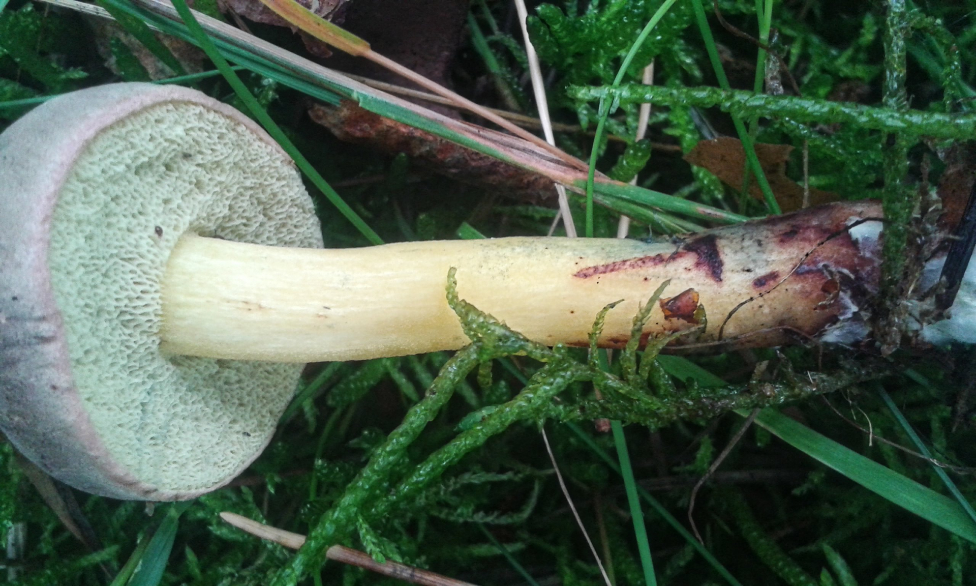 Ganz frisch blaut er sehr stark. Leider sind die Bilder im Wald mit dem Handy bei dem trüben Wetter nicht gut geworden. Ich würde den Pilz als Starkblauender Rotfußröhrling Xerocomus cisalpinus bezeichnen, oder liege ich daneben?