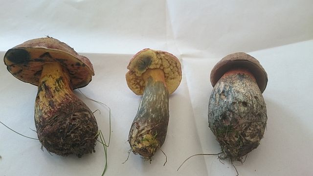 • Die Bilder sind von Pilzen die zu mehreren Gruppen unter ein und derselben Edelkastanie wuchsen. Es gab verschiedene Meinungen ich dachte es seinen unterschiedliche Expemplare Kollegen sind der Ansicht es handelst sich um die selbe Spezies und die Unterschiede sind nur wegen unterschiedlichen Sonneneinstrahlung odr Bodenverhältnissen bedingt. Der Schwamm ist wie man sieht gelb oder auch dunkel Braun der Konvexe Hut ist braun aber auch Rötlich gefärbt. Das Fruchtfleisch wird schnell blau. Der Stiel hat eine Netzarige Maserung. Alte Exemplare haben netzarige Musterung der Hutoberfläche. Wer weiß es besser? Um welche Art oder Arten handelt es sich.