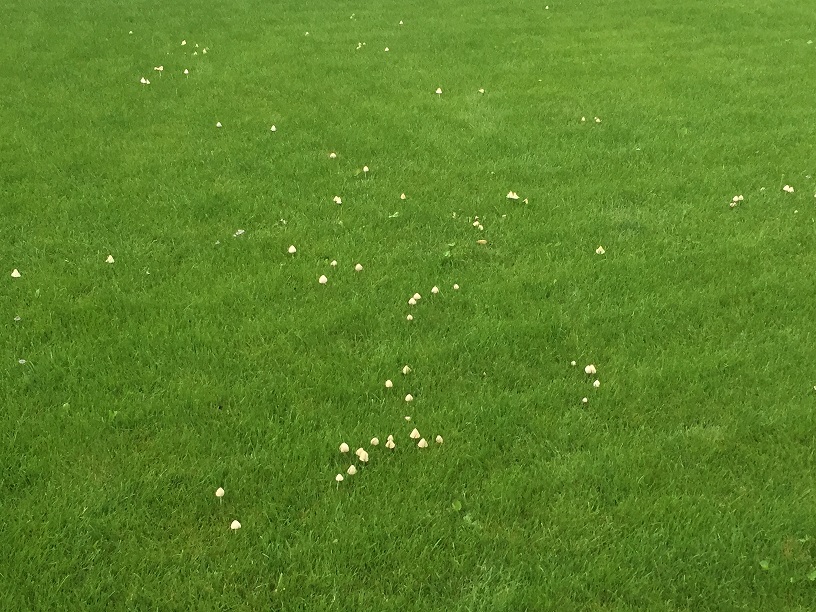 Vergleich deinen Rasenpilz, bzw. der deines Kumpels, mal mit dem Milchweißen Samthäubchen (conocybe albipes)