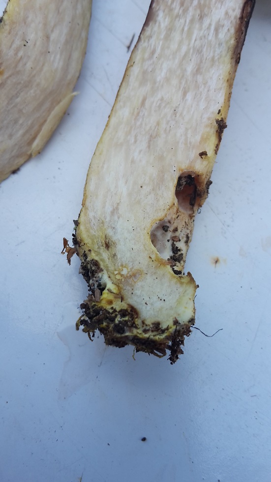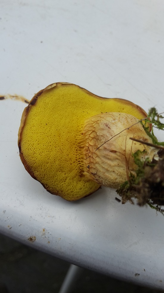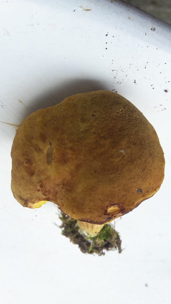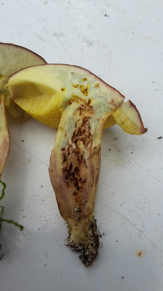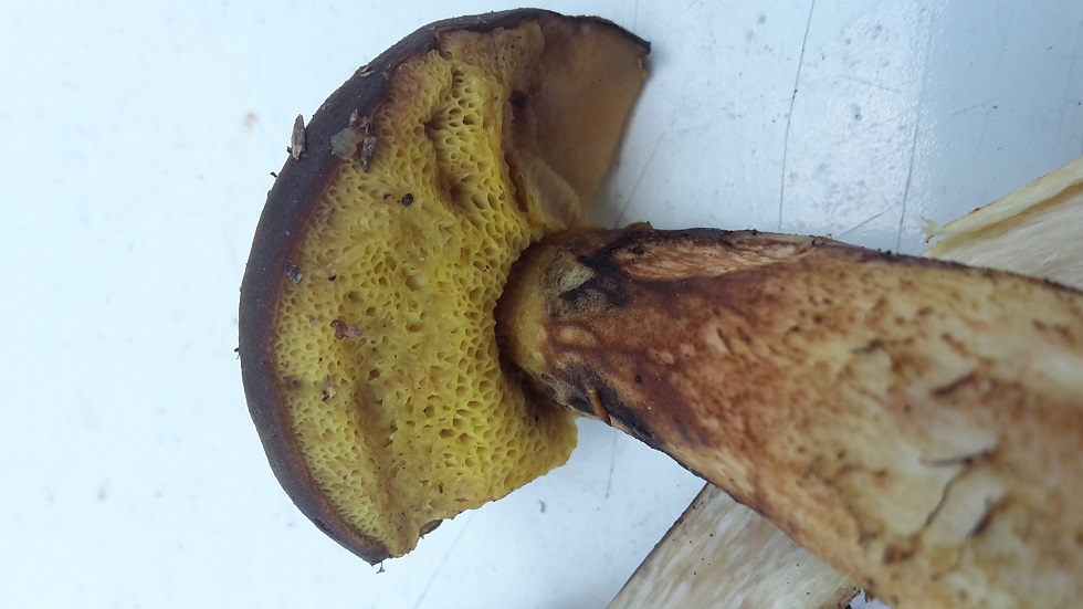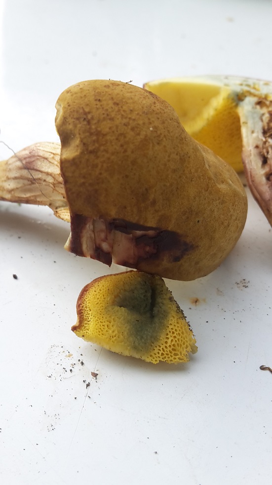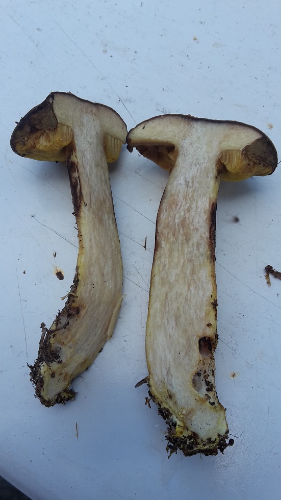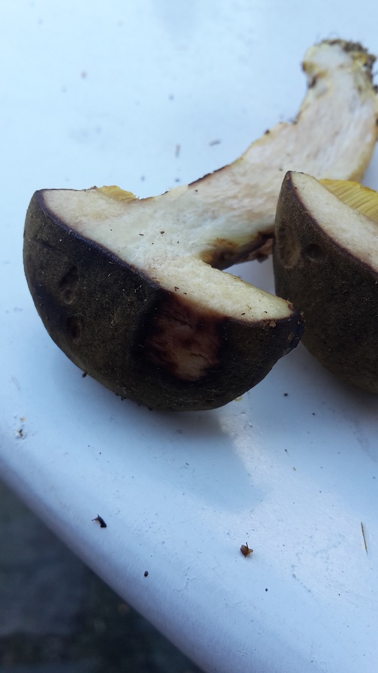 Bei dem hier bin ich mir unsicher - falls das auf dem Stiel ein Netz sein sollte...und weil er im Schnitt leicht bläut und zur Basis hin rötet...und auch an den Röhren leicht bläut. Doch eine Rotfuß (wo ist der rote Fuß)? Oder ein Brauner Filzröhrling (der aber nie bläut - oder? Ich bin verwirrt ![]()