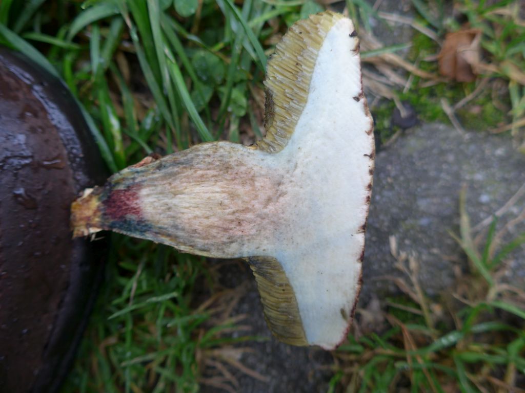 Problem: stark rote Stielbasis, unterhalb der Roten Zone waren Pünktchen dieser Farbe in der Stielbasis; Basismycelfilz nach Entnahme gelb, starkes dunkles Blauen 5 min nach Aufschneiden in der "Stielrinde", Stieltrama innen rosalich. komisches Ding. :/