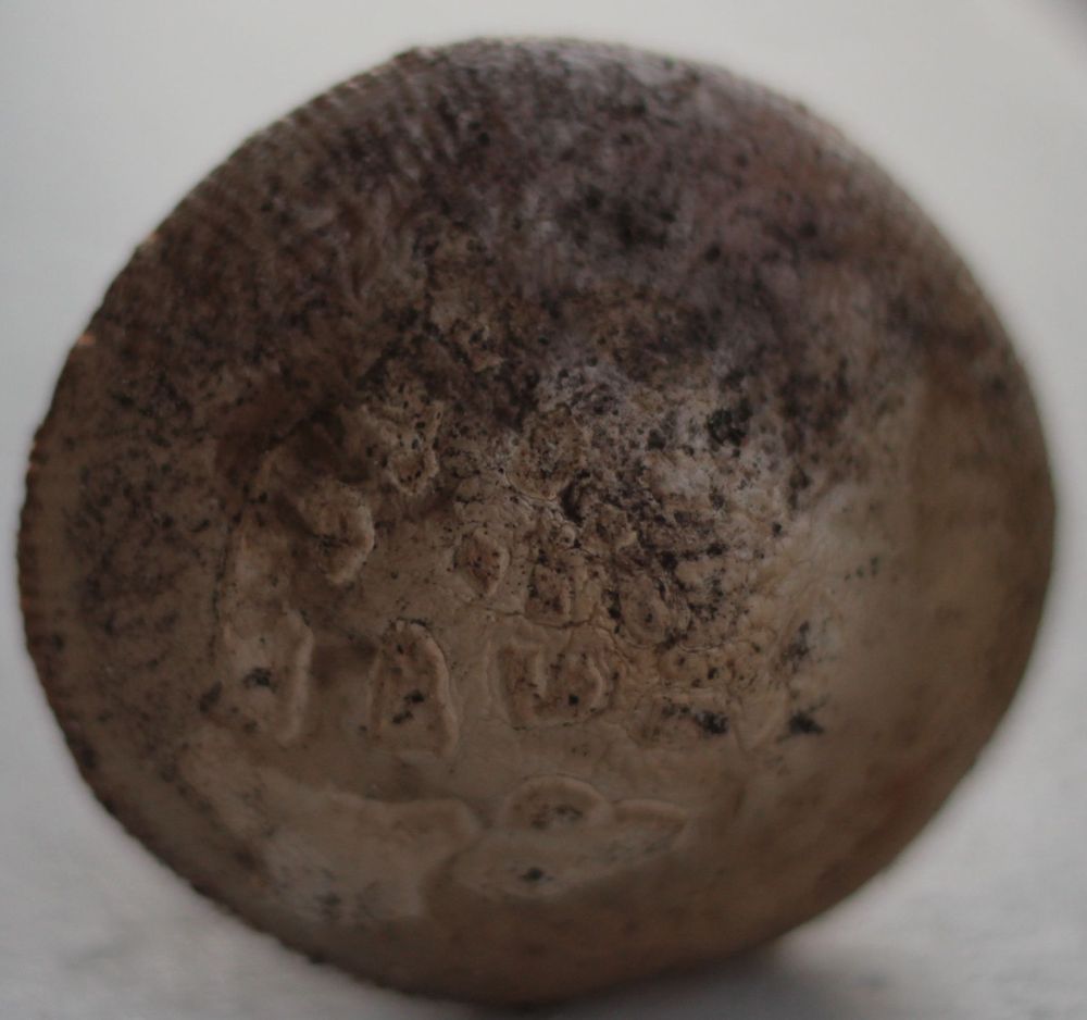 Hut: graubraun, ca. 5,5 cm Durchmesser, Rand gerieft, in der Mitte wahrscheinlich die Reste des Gesamthülle