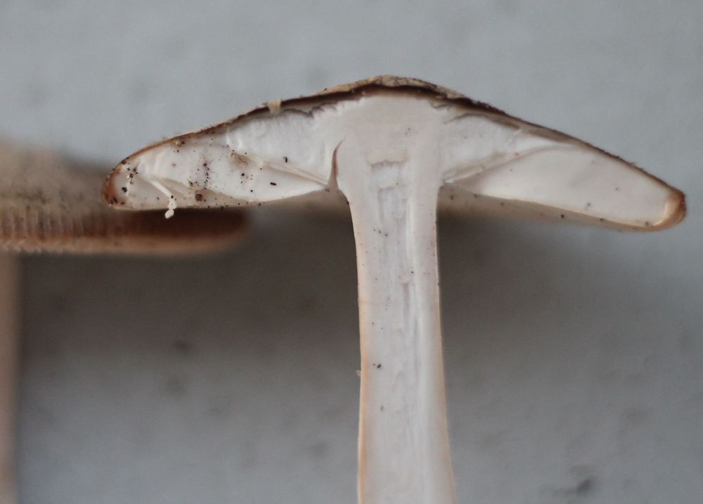 • Öhm... Vor allem Gesamteindruck. Bei Volvariella kommen solche Velumreste auf dem Hut nicht vor. Auch würde ich da bei Fruchtkörpern in dem Alter schon ein deutliches Rosa bis Rosabraun in den lamellen erwarten. Auch der Fingerabdruck auf der Stieloberfläche hat was zu bedeuten (ist mir bei vielen Scheidenstreiflingen schon passiert, bei glattstieligen Arten) und die Riefung am Hutrand sieht auch sehr danach aus.