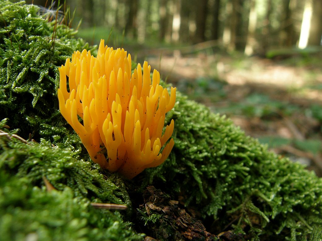 Darunter unter anderem hübsche Zwergerlfeuer (Calocera viscosa):