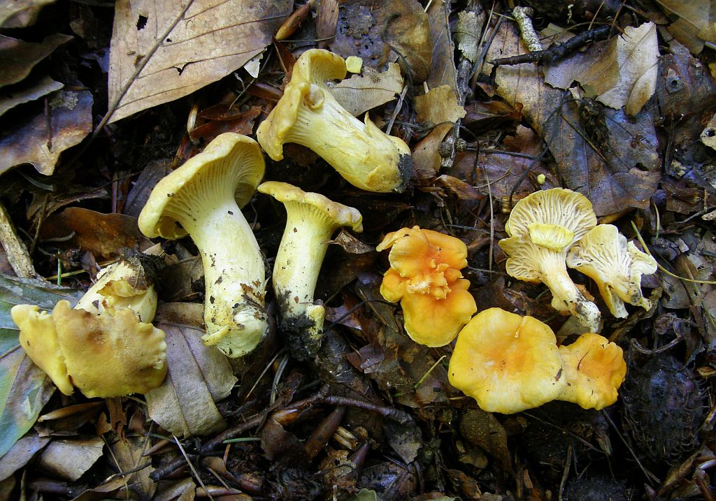 Cantharellus friesii unten, Cantharellus cibarius (var. amethysteus) oben: