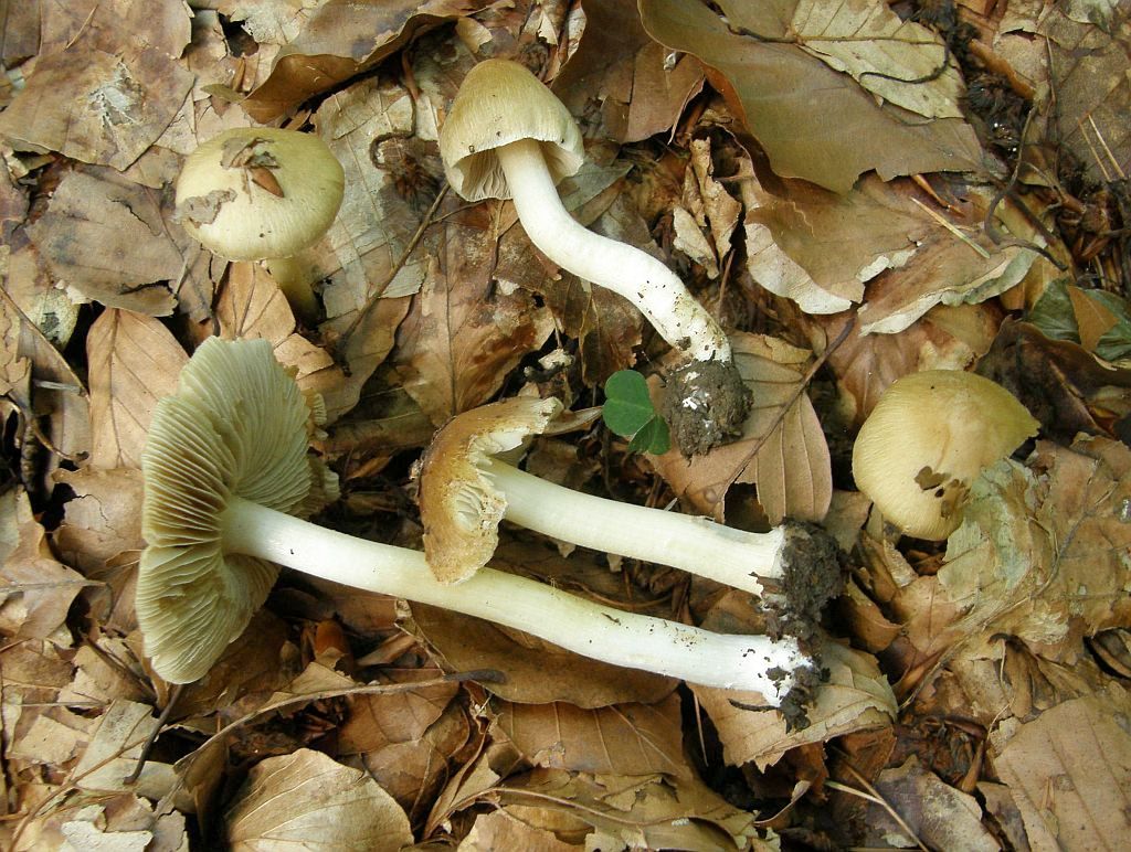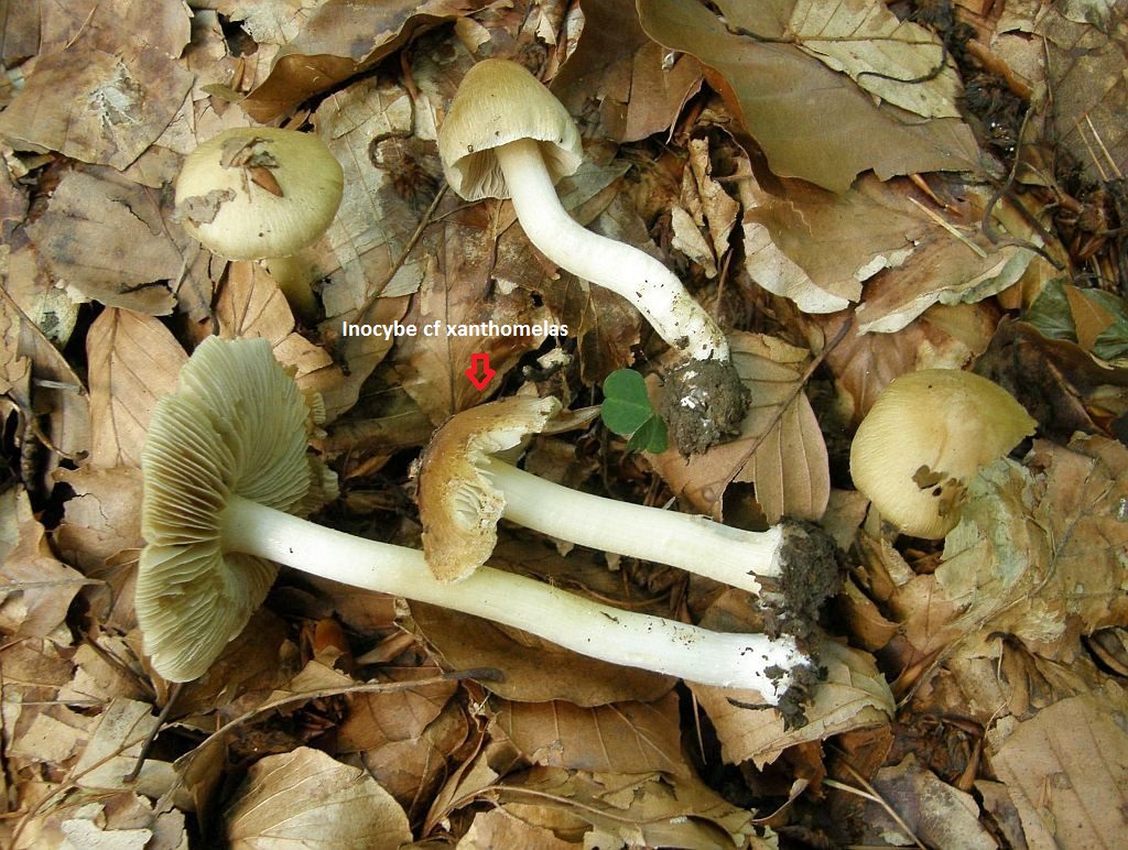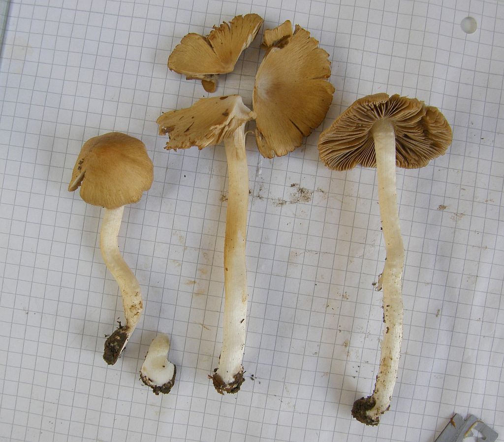 Täublinge und Milchlinge, die ich nicht fotografiert habe; aber irgendwie stand der ganze Wald voller Risspilze. Die waren meist recht groß, irgendwie ockerlich mit weißen Stielen und hatten alle eine deutlich abgesetzte, teils sogar gerandete Knolle. Irgendwann habe ich mich mal hingehockt und ein paar dieser Risspilze in Armreichweite zusammengeklaubt: