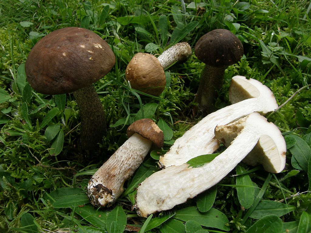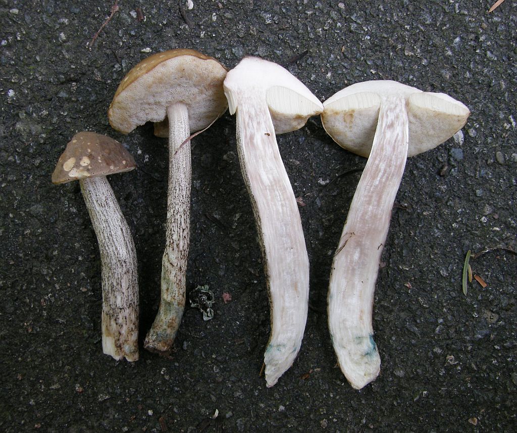 Wo man mal schön die farbliche Variationsbreite von ganz dunkel nach ganz hell sieht. Leccinum melaneum war kurz in der Diskussion, aber hier sind auch an der Stielbasis nur die Schuppen schwarz, die Stieloberfläche darunter ist weiß. Und genau die müsste bei Leccinum melaneum schwarz sein, sonst ist er es nicht.