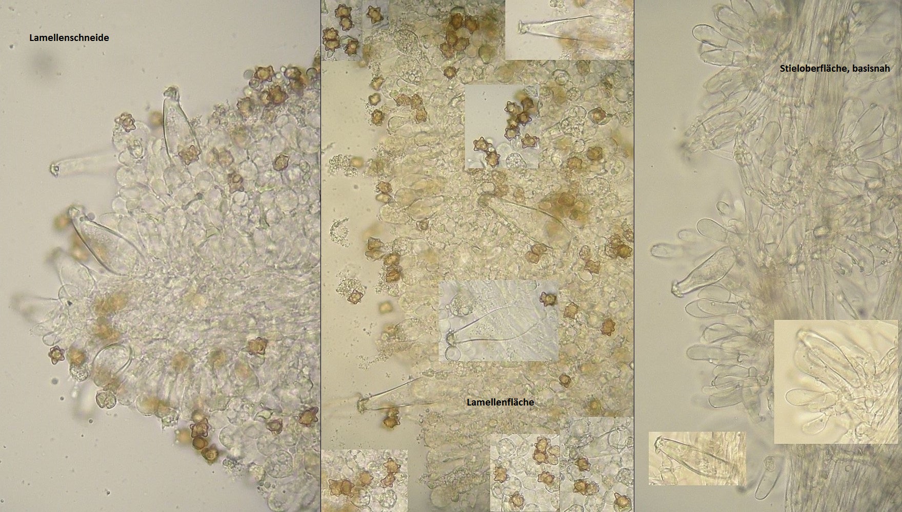 recht kräftige Pilze mit stark mehlgurkigem Geruch und hygrophanen Hüten, HDS - Pigment nur intrazellulär, nicht inkrustiert, Schnallen überall reichlich vorhanden, und was ich erst für Cheilozystiden hielt, sind wohl nur viele schmale, junge Basidiolen.