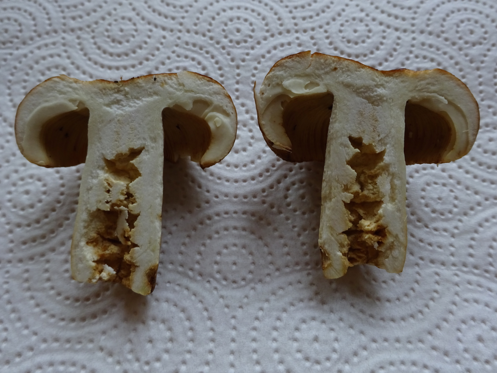 Ich bin mir nicht sicher, ob die anderen Stinker auch so ein Muster auf den Lamellen haben dürfen; gerade auch mit einem Trockenschaden. Was auf jeden Fall nicht schadet: Mach mal 20%iges KOH auf den Stiel. ;)