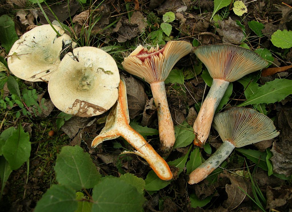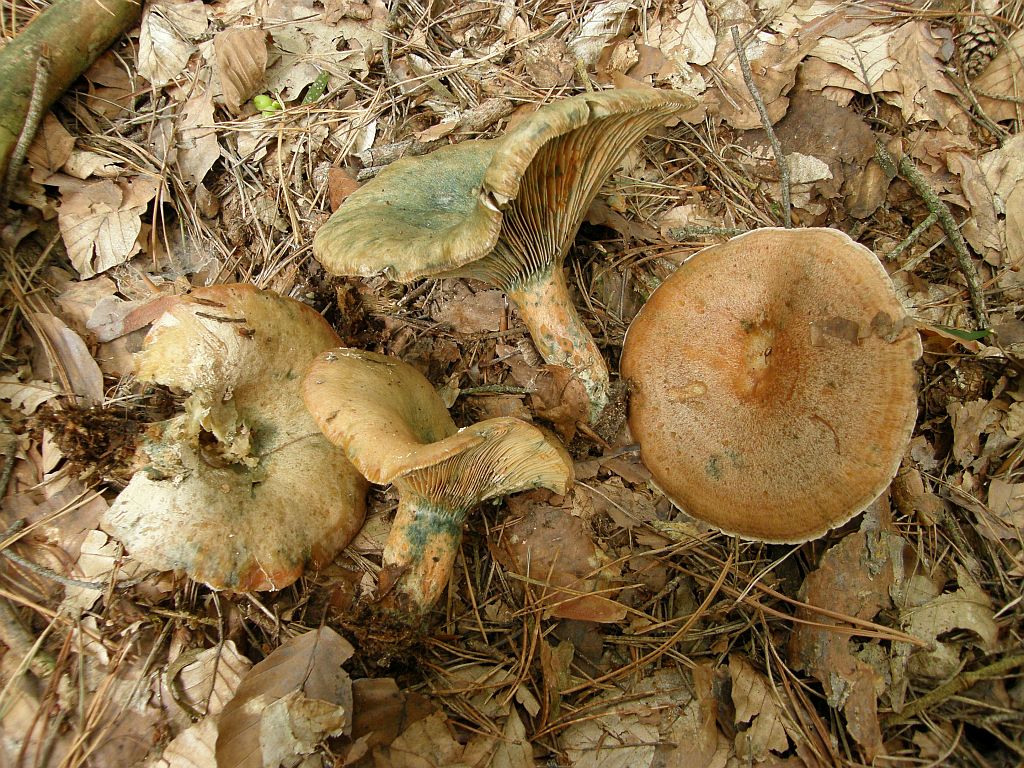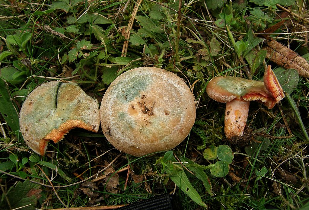 5a) Stiel niemals mit Grübchen; Fruchtkörper bald mit grünen bis graugrünen Flecken oder flächig grünlich überlaufen; Im Alter oft gesamte Fruchtkörper grünlich; Mykorrhiza mit Fichte (Picea abies) ---> Lactarius deterrimus (Fichtenzeizker)