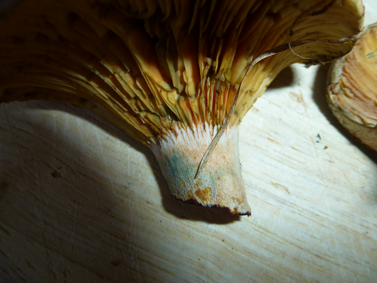 Den Wechselblauen (Lactarius quieticolor) habe ich in der Tat noch nie mit nach hause genommen. Weil ich die angeschnittenen Fruchtkörper immer nur solange beobachtet habe, bis ich Lactarius semisanguifluus (Spangrüner Kiefernreizker) auschließen konnte. Also etwas mehr als fünf Minuten.
