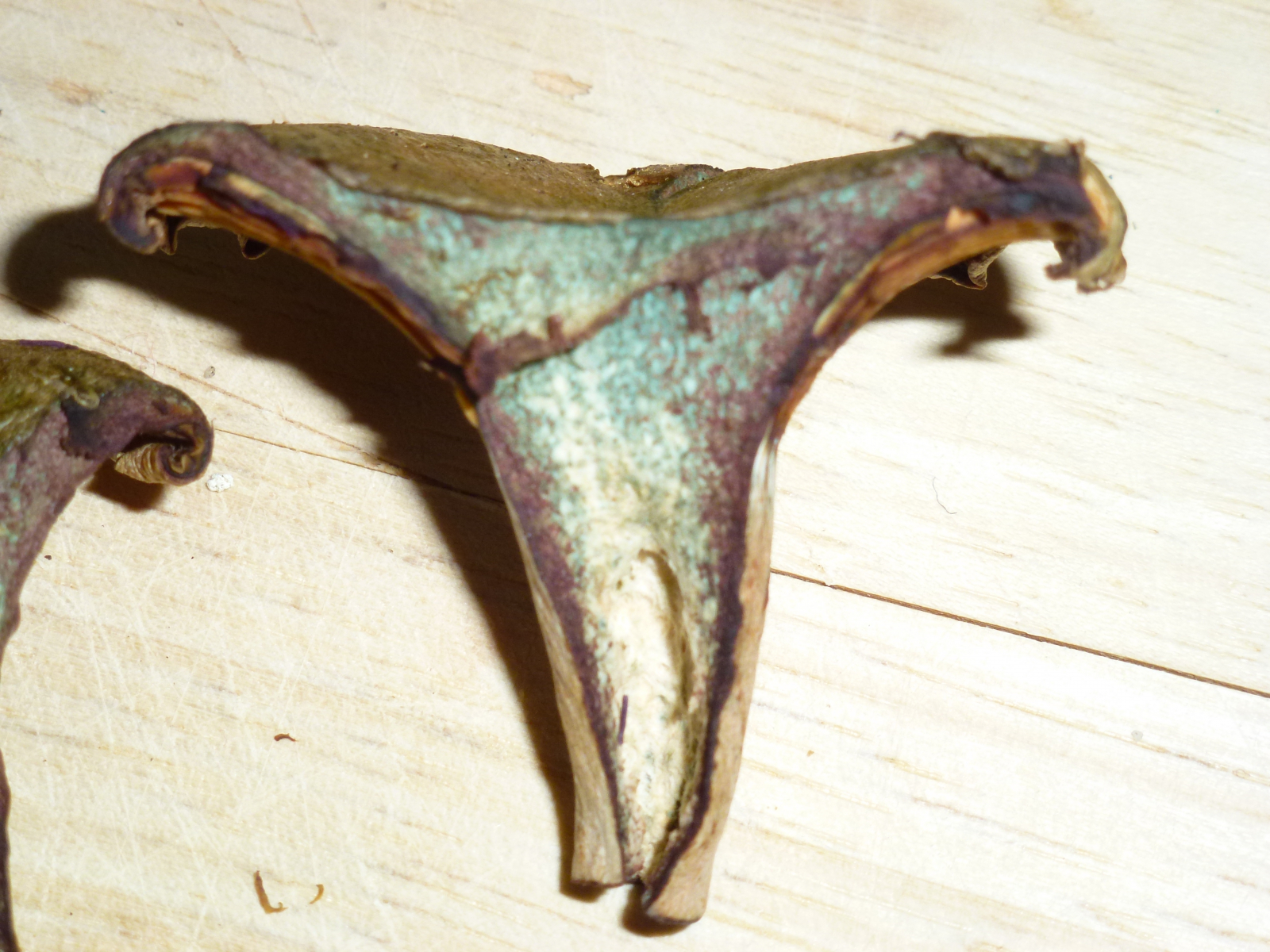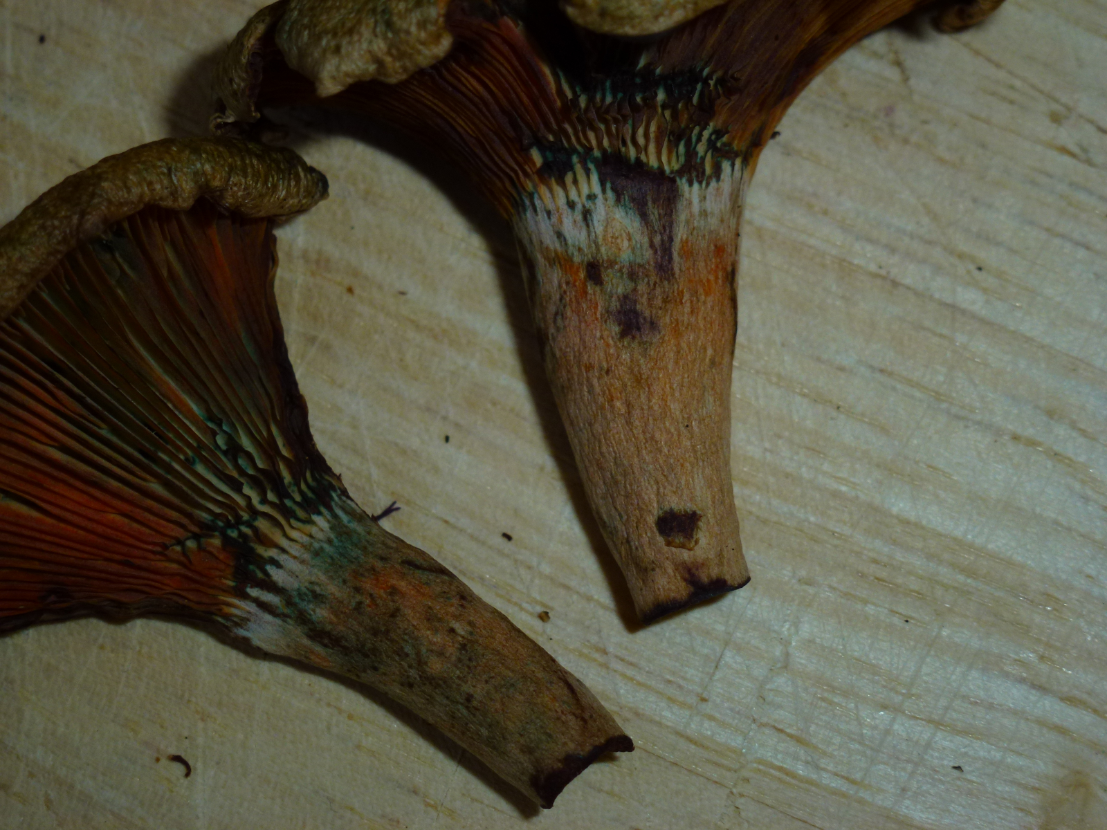 Aber die sind ja auch ziemlich angeknabbert an den Lamellen. Ich setze jetzt mal voraus, daß diese grün verfärbten verletzungsstellen schon vorhanden waren, als du die Pilze gefunden hast?